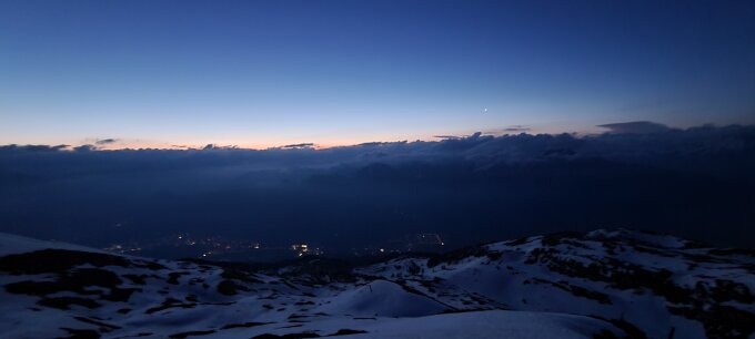 Schneedecke öfters nicht durchgefroren, auch am Grat nicht. Teilweise Nebelaufzug. Fels am Grat oft frei und ohne Schnee. Kühler Wind, sonst tiptop.
