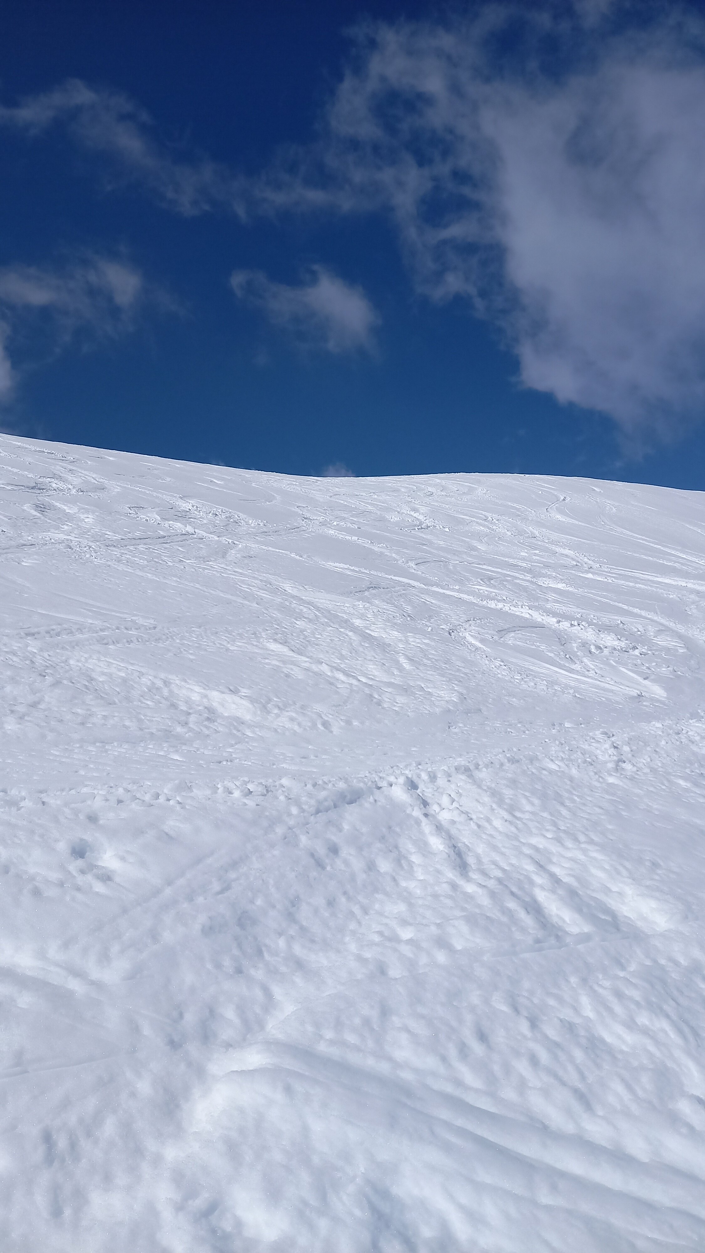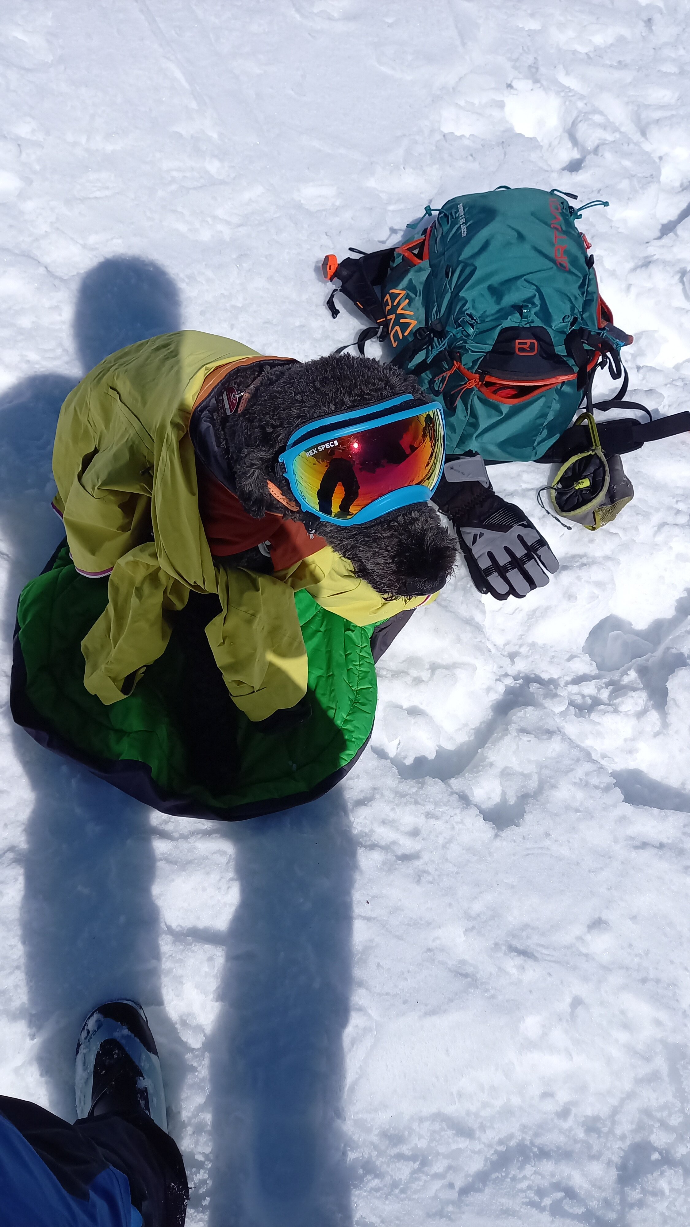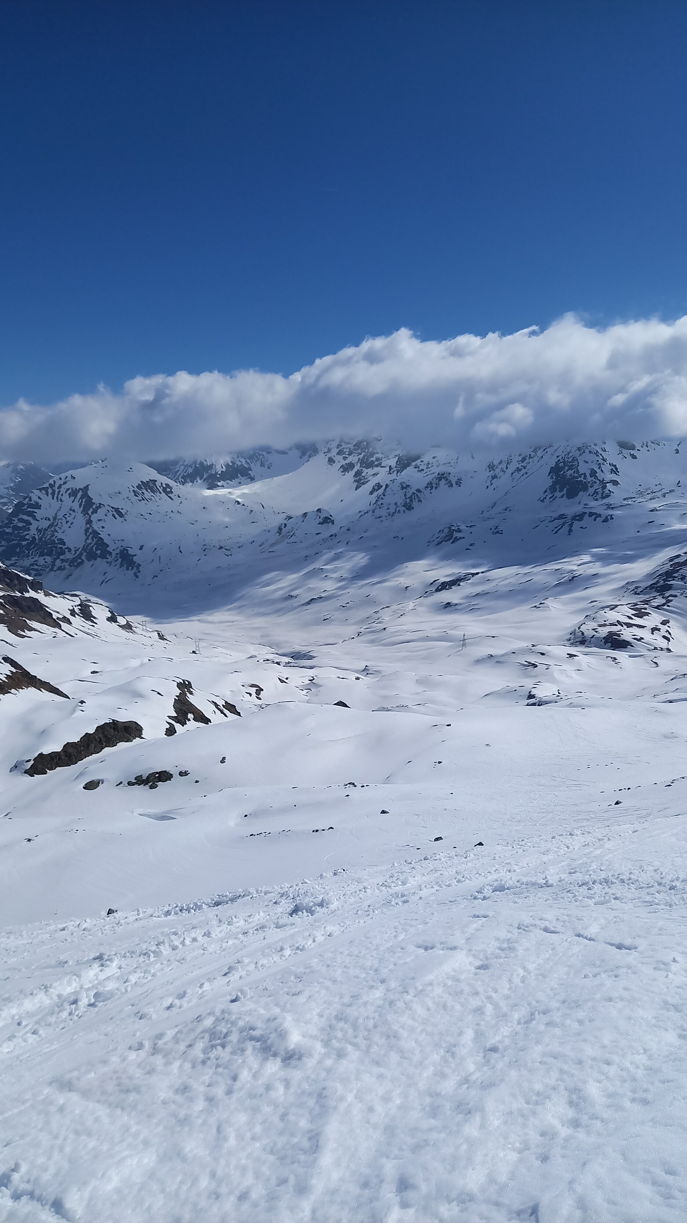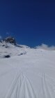 Im oberen Teil dominierte Hartschnee mit etwas schönem Sulz bis etwa 2500. Ab hier war es immer mehr Kampf und Krampf (v.a. für den Vierbeiner) da man teilweise bis zur Hüfte völlig unvermittelt in Beton-artigem Nassschnee stecken blieb. Das Flachstück raus nach Bivio war auch dementsprechend mühsam
