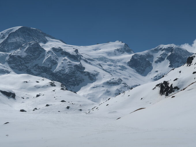 Gipfel Firn; dann Sulz (Abfahrt 13 Uhr) Steilhang neben Bockberg am Morgen hart gefroren. Ganz rechts hoch, ein kurzes Stück zu Fuß sicherer