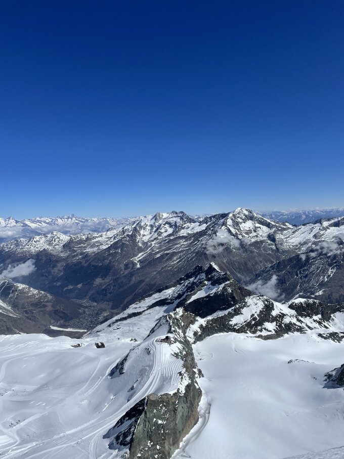 Es hat sehr wenig Schnee im Gebiet. Trotzdem sind die Verhältnisse am Allalinhorn gut bis sehr gut.