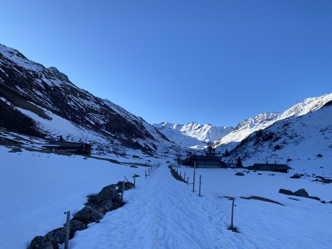 Ab Davos Teufi (kleiner Parkplatz) ist die Straße nach Dürrboden schneebedeckt (4-5 kurze Tragestrecken. Aufstieg über Scarlettapass auf gut gefrorener Schneedecke problemlos zu machen. Auch die Passage auf den Gipfel ist recht gut zu gehen. Wer sich wohler fühlt bei steileren Hartschneepassage sollte Harscheisen dabei haben. Die Abfahrt nach Norden (ehem. Scalettagletscher) ab der Scharte zwischen Scarlettahorn und Piz Grialetsch war um 11:30 Uhr noch hart gefroren und ist durch alte tiefe Fahrspuren etwas unrund zu fahren. Die Osthänge sind am Vormittag im Dischmatal sicherlich mit gutem Firn zu fahren gewesen (sah gut aus, was da ab Abfahrer*innen zu sehen war. Ab 2.500 m fand ich dann auch etwas Firn für schöne Schwünge. Dank "Schnellwachs" war auch die ziemlich flache Fahrstraße ab Dürrboden ganz gut zu bewältigen. Herrliche Bergkulisse und zum Abschluss der Einkehrschwung auf der Sonnenterrasse des Gasthus Teufi.