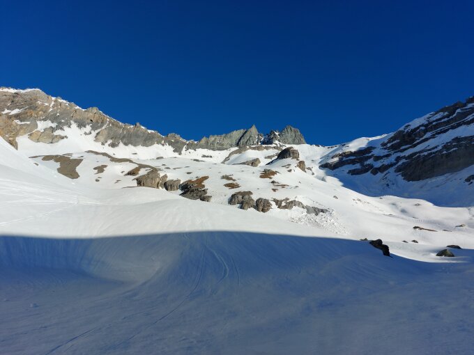 Der Schnee im Couloir geht langsam aus, hat bereits einige eisige Stellen drin vom Schmelzwasser. Dürfte noch zwei drei Tage gehen.