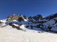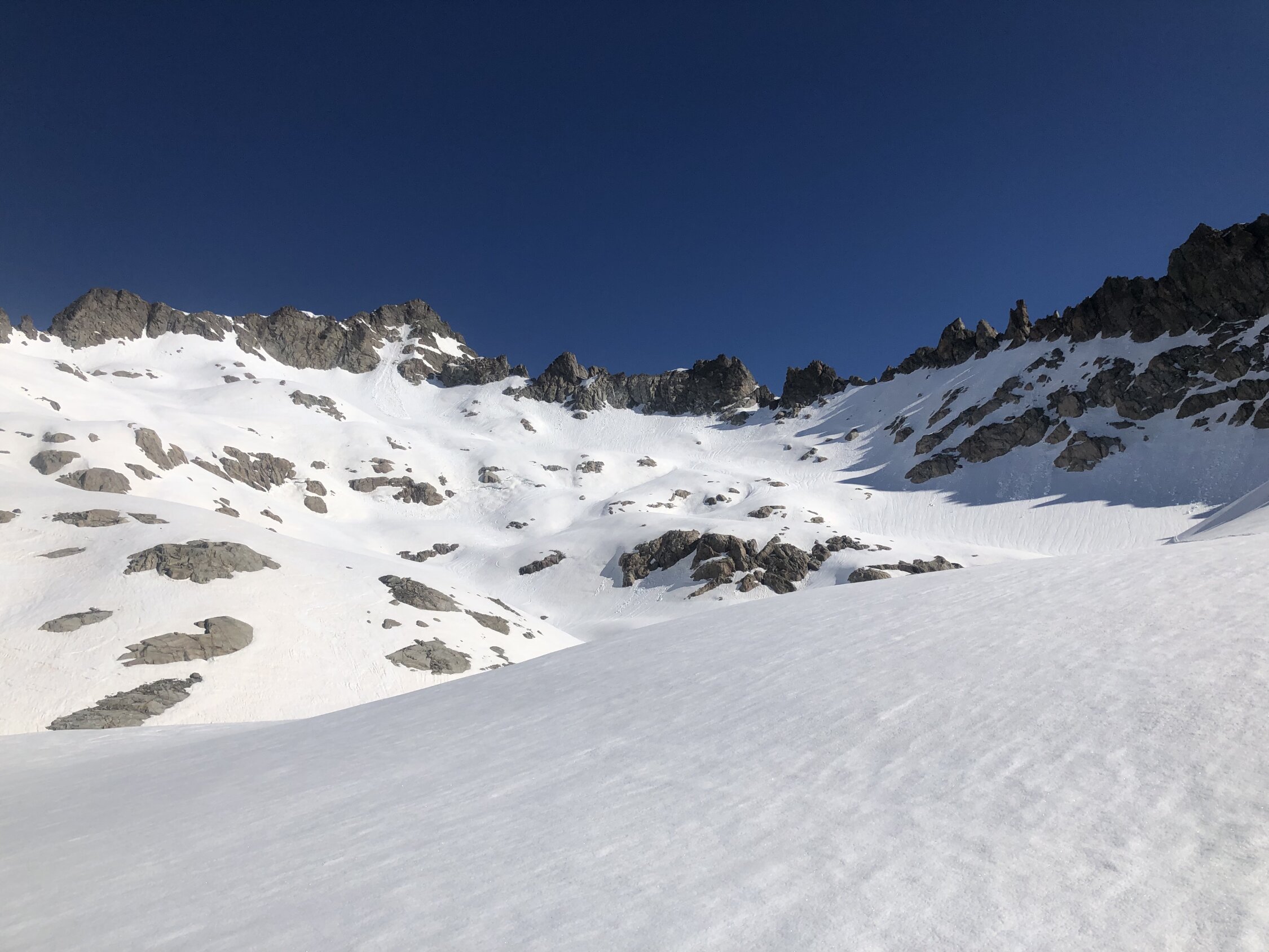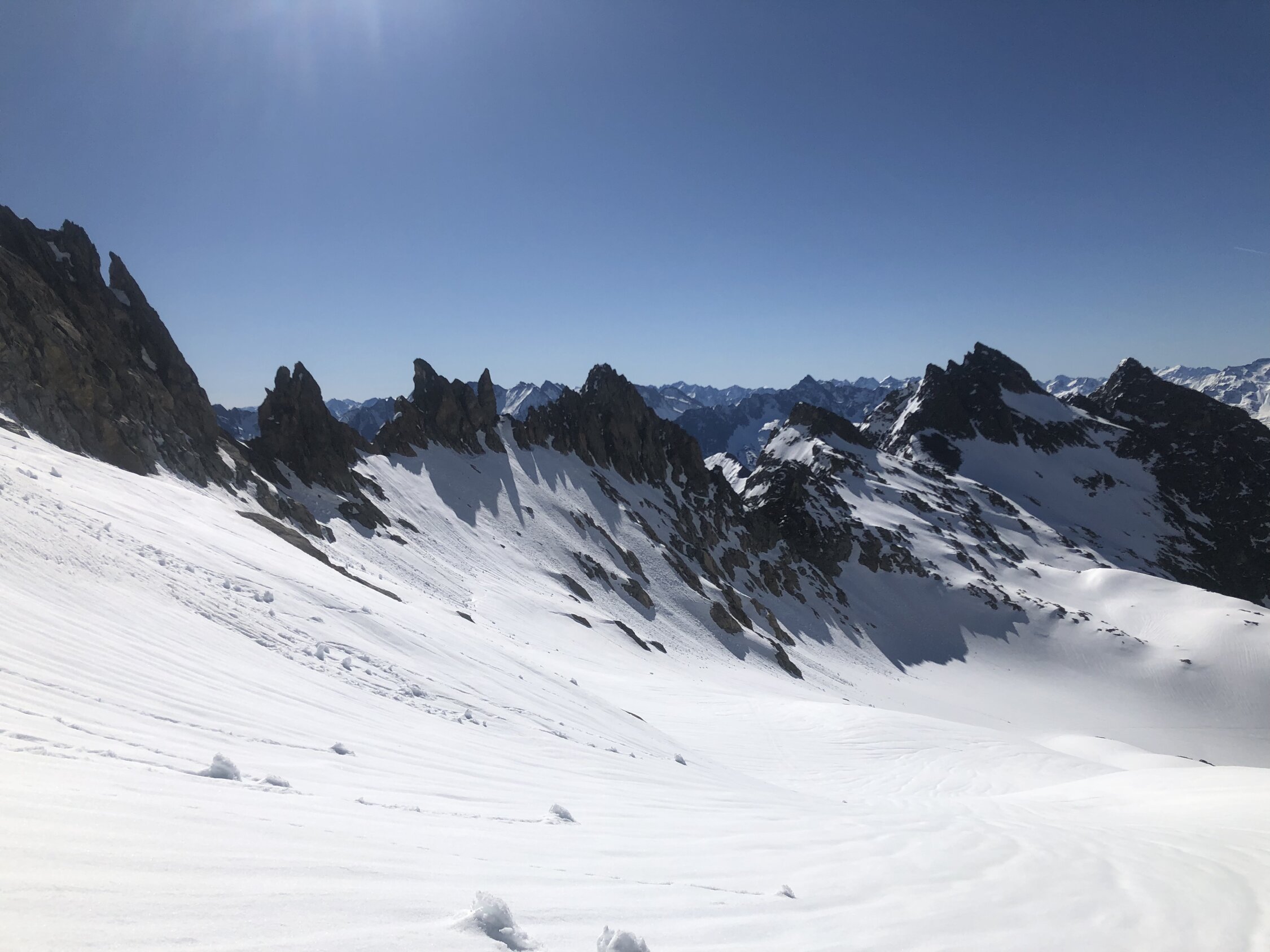 Danach praktisch durchgehend Schnee. Der Steilhang zum seewenstöss ist mühsam, da hart und mit lawinenschnee. Danach ohne Probleme zum skidepot unter dem couloir. Von hier mit pickel/steigeisen auf den Gipfel (stellenweise hartschnee).