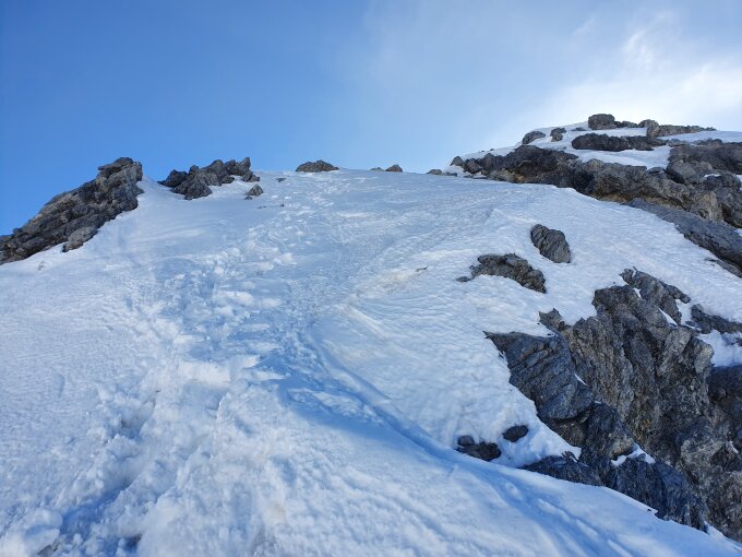 Ab dem Gratausstieg von Route Nr. 1 benötigt man mit guten Trittspuren 15 Minuten bis zum Gipfel. Die Steigeisen habe ich im Rucksack gelassen, den Pickel aber einsatzbereit gehabt. Harscheisen brauchte ich heute nicht. Aber Steigeisen, Harscheisen und Pickel unbedingt für alle Fälle mitnehmen!