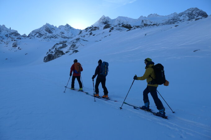 Tolle Verhältnisse am Ofenhorn. Die Schlüsselstelle am Einstieg zum Ostgrat ist perfekt eingeschneit und die einzige Spitzkehre im steilsten Stück habe ich noch mit einem Podest entschärft. Der Sabbionegletscher ist wie gewohnt mit viel Schnee bedeckt und problemlos