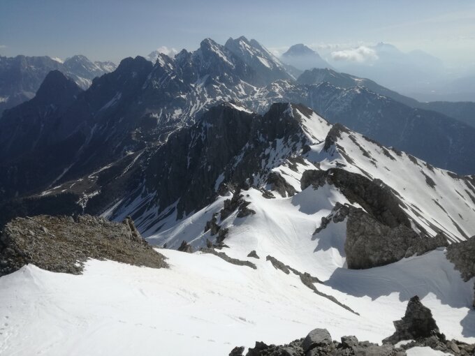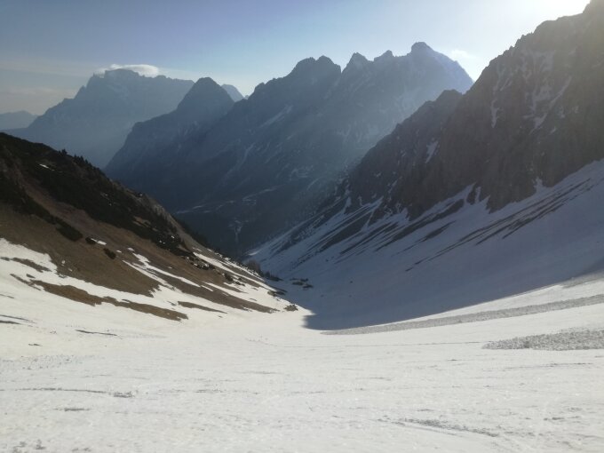 Abfahrt durch das rechte Rinnensystem direkt vom Gipfel um ca. 10.30h in teilweise gutem Firn - aber meist Lawinenschnee. Ab Rinnenausgang perfekter Frühjahrsfirn.