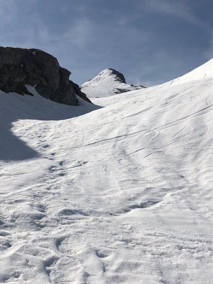 Aufstieg hart. Abfahrt so gegen 12.00 Uhr super Sulz. Für den Gipfelaufstieg vom Skidepot sind Steigeisen komfortabel.