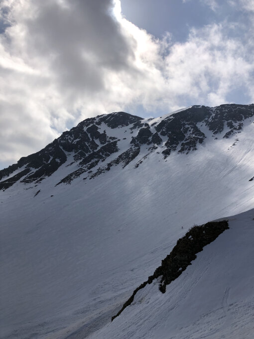 Noch überraschend viel Schnee am Gaishorn. Aufbruch morgens um 6:15 (hätte aber auch noch später sein können). Zunächst musste ab dem Parkplatz eine gute halbe Stunde getragen werden (2,32 km, 230 Hm). Da, wo der Sommerweg auf den Fahrweg trifft, können die Ski angezogen werden - ein dünner Schneestreifen reicht hierfür sowohl für Aufstieg als auch für Abfahrt noch gut aus. Der steile Aufstieg zum Gaiseck war stark vereist und selbst mit Harscheisen war der Aufstieg schwierig. Der Grat vom Gaiseck zum Gipfel ist freigeweht, daher Skidepot am Gaiseck und zu Fuß zum Gipfel. In der Abfahrt Mischung aus vereisten Hängen und Firn. Insgesamt ganz gut fahrbar.