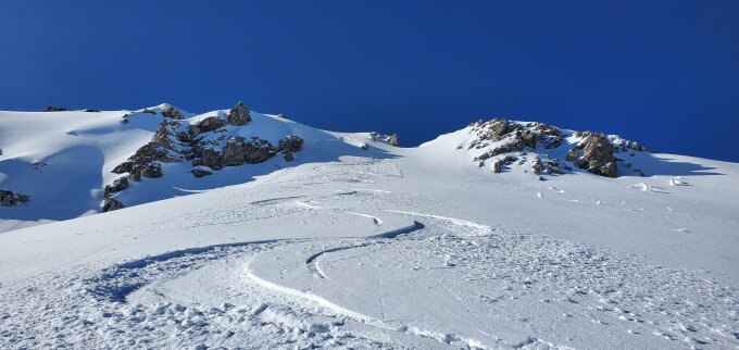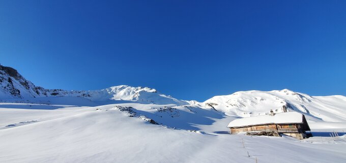 Schnee ab 1600 in der Hang oberhalb Ramse (noch sehr wenige Tage) und durchgehend bis Gipfel. In Gipfelwand, 10-15cm Pulver auf harte Unterlage.. genial zu Abfahren (bissl rutschig im aufstieg): war so cool, dass ich sogar 3 Mal abgefahren bin. Kaiserwetter sonst