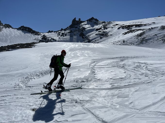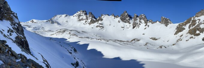 Immer noch eine schöne Tour - Schnee ab Furt, am Gipfelhang sogar neuer Pulver, der Gipfel selbst direkt über den Vorgipfel gut erreichbar. In der Abfahrt von der Wildseeluggen bis Furt schöner Sulz.