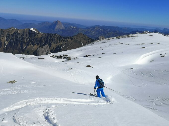 Ab 7.30 Uhr mit erster Bahn hoch, Hartschnee, jedoch Aufstieg ohne Harscheisen gut machbar, Abfahrt neben den Vortagesspuren gut, mehrheitlich noch Hartschnee. Durchgehend geschlossene Schneedecke.