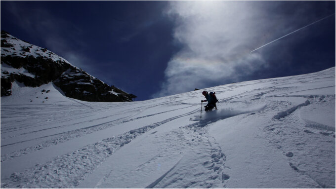 Der Neuschnee ist noch nicht umgewandelt, zumindest ab einer Höhe von etwa 2800m Im Einzelnen: Ab Gipfel bis etwa 3500m, ruppig aber im Prinzip troztdem gut fahrbar. Weitere 200Hm sehr rustikal. Dann Firn bis Hütte. Ab hier ca. 300Hm Pulver, danach feuchter Pulver, aber gut fahrbar. Danach Firn bis zur Piste bzw ins Tal.