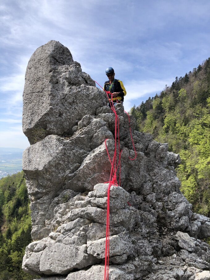 Schöne Klettertour im soloturner Jura, mit schönen Ausblick auf Eiger Mönch Jungfrau und im Tal die Aare.