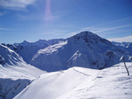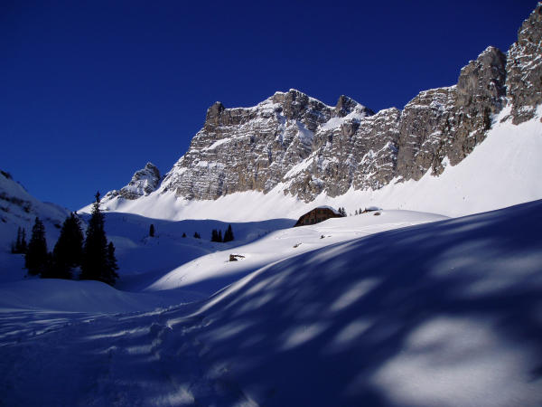 Unten Schnee bereits knapp. Ab der Hütte (Pkt. 1740) bis zum Sattel sind in der Abfahrt einige schöne Schwünge möglich. Auch das Befahren der NNW-Flanke scheint vernünftig, aber diese ist bereits stark verfahren.