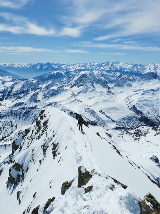 Start 4.30, Aufstieg via Léchère, erste 400hm mit Zustiegsschuhen auf Wanderweg. Aufstieg bis Pte Col Ferret sehr gut. Harscheisen auf Höhe Bivacco Fiorio montiert. Gletscher genügend eingeschneit, keine Spur vorhanden, etwas eisig, ansonsten beste Verhältnisse. Auf 3460 einige Meter zu Fuss aufgestiegen, dann wieder mit Ski zum Skidepot (3650). Aufstieg vom Skidepot mit Steigeisen und Pickel gut, ohne Spur.
