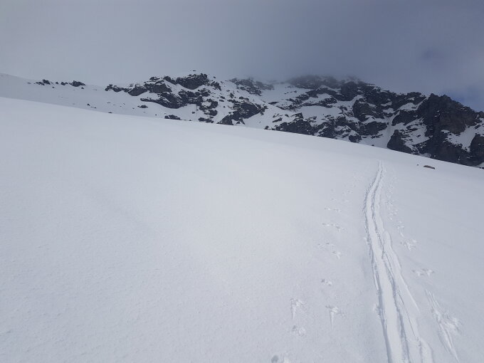 Ab Parkplatz ca. 300m schneefrei, bis die ersten durchgehenden Schneerinnen beginnen. Je nach Routenwahl, Harscheisen heute sinnvoll. Grat und Gipfelbereich sehr gut eingeschneit und problemlos mit Skis zu bewältigen. Oberer Teil der Abfahrt heute mit ein paar Zentimetern Pulver bestens zu fahren, unterer Teil eher hart aber schön griffig.