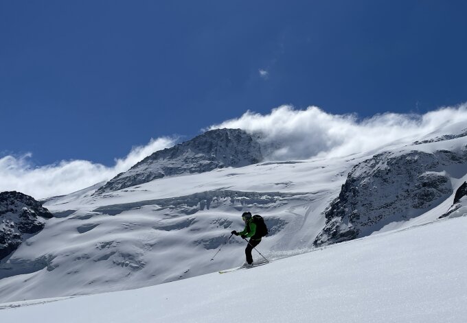 Abfahrt über die N-Seite sehr steil, Einfahrt nicht übersichtlich. Wir sind vom Gipfel zum Brunnenstock gequert und dann über die S/SO Seite abgefahren, Firn. Top.