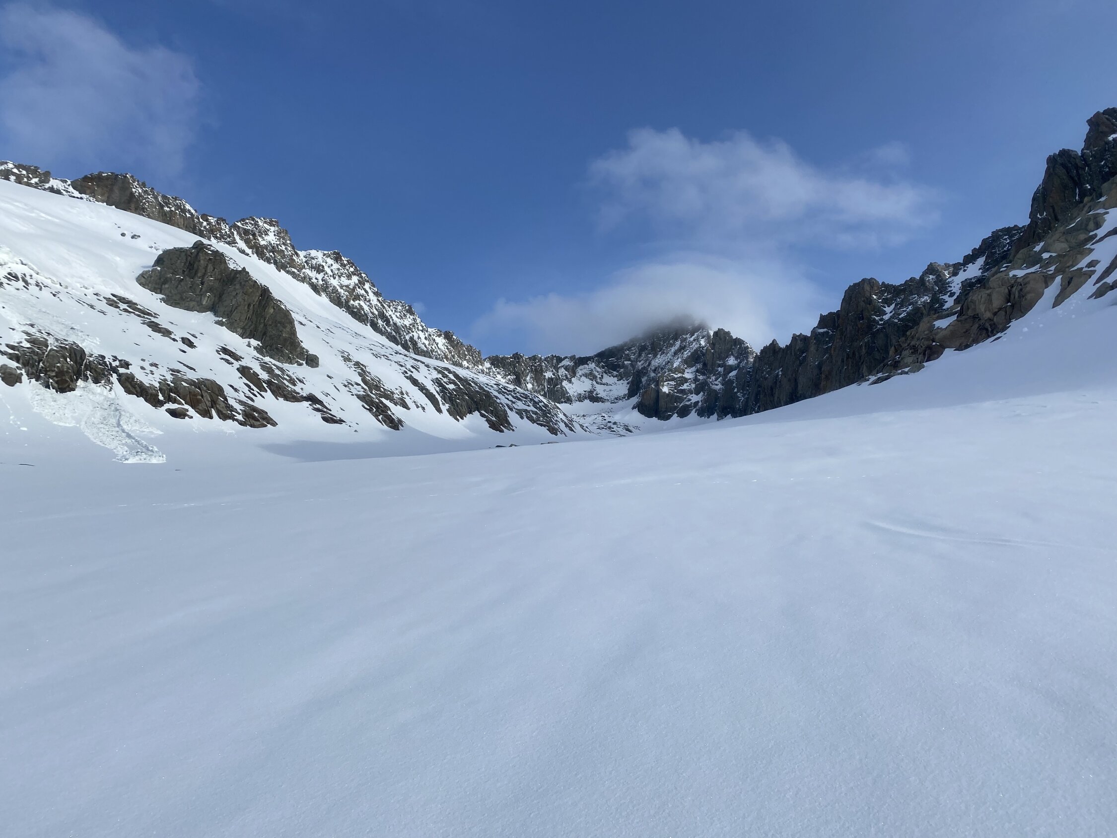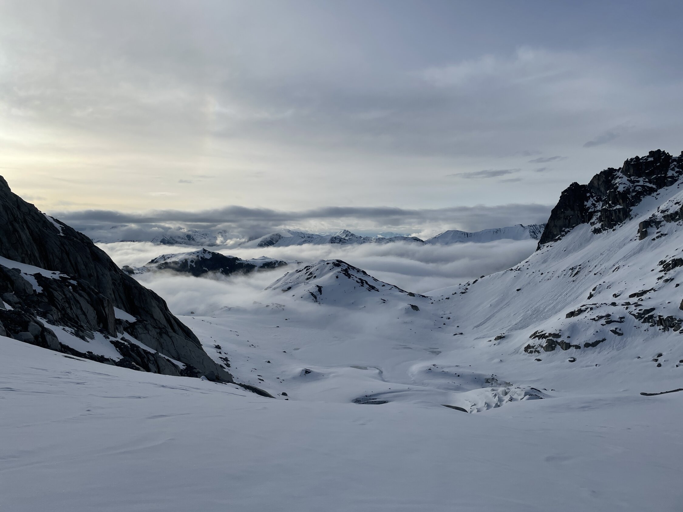 Ab Passstrasse ca. 15min Skiportage. Danach durchgehende Schneedecke, bis 2500m jedoch Nassschnee, danach bis 2700m brechende Kruste. Darüber tragende Schneedecke.