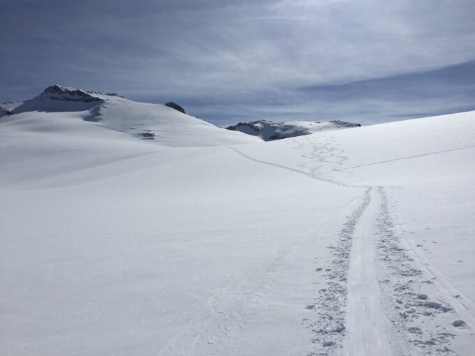 Anschliessend gute Spur bis zum Gipfel mit wenigen cm Neuschnee. .Ging gut ohne Harscheisen