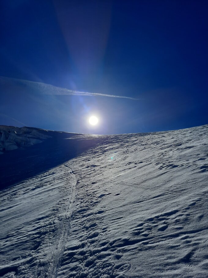Zufahrt zum Steingletscher schneefrei. Ab Steingletscher geschlossene Schneedecke ohne Skitragen. Unten bis zum 1. Plateau mühsamer alter Nassschnee. Steilstück zum 1. Plateau nur mit Harscheisen oder Ski tragen. Oben top Verhältnisse. Am 6:00 Uhr Start. Abfahrt 10:30 Uhr. Toller Sulz.