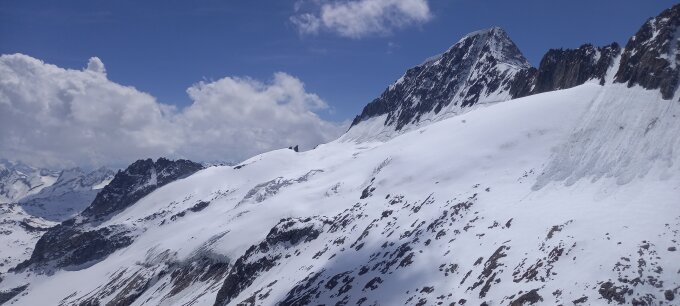 Von der Albert Heim-Hütte durchgehend mit Skiern zu machen. Auf dem Grad aureichend Schneeauflage für Problemlosen Aufstig. Abfahrt gegen 11:00h, nur bis ca. 2.900 m schon tiefer Firn, danach Sulzschnee, Abfahrt war noch bis ca. 100 HM über Tiefenbach möglich.