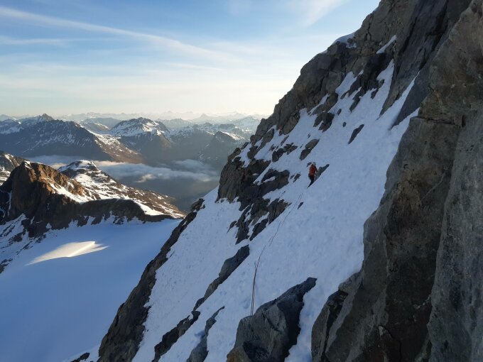 Der Fels hatte nicht genug Eis, um Eisgeräte einzusetzen, und war an einigen Stellen nass. Die Felsbänder waren mit hartem Schnee bedeckt. Aus diesem Grund kletterten wir die gesamte Route mit Steigeisen und Eisgeräten. Wir brachen früh um ca. 3 Uhr von der Diavolezza auf und sind über die Joos Coulior Abseilpiste abseilt. Am Nachmittag gab es in diesem Gebiet Anzeichen von Stein- und Eisschlag sowie zahlreiche Nassschneelawinen.