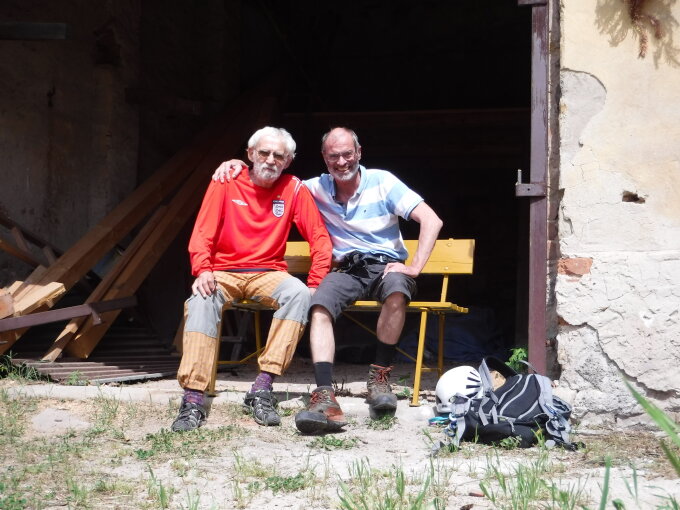 Als ich auf dem Rückweg von meinem Frühsport über der Elbe an der Schäferwand von Děčin am späten Vormittag auf der KS-Anlage der Via Ferrata Kavárnička herumturnte, kam Karel Bělina (siehe Wikipedia) vorbei, um nach dem rechten zu schauen. Ich begegnete ihm bereits am 11.4.2015, als er an der Schäferwand das Gelände im linken Wandabschnitt begann, freizuschneiden und die Routen Nrn. 13 bis 16 zu errichten.