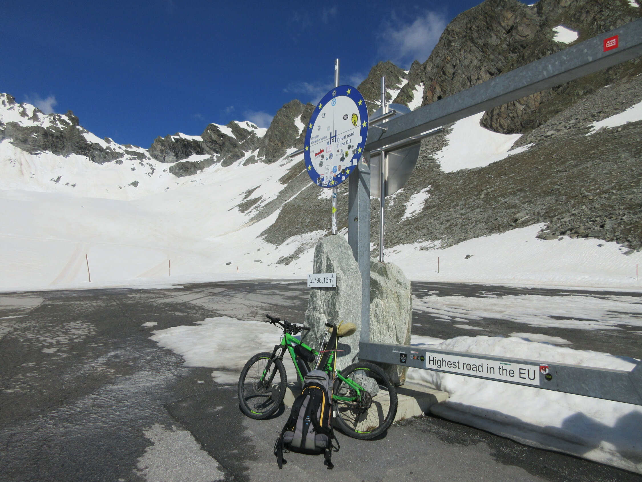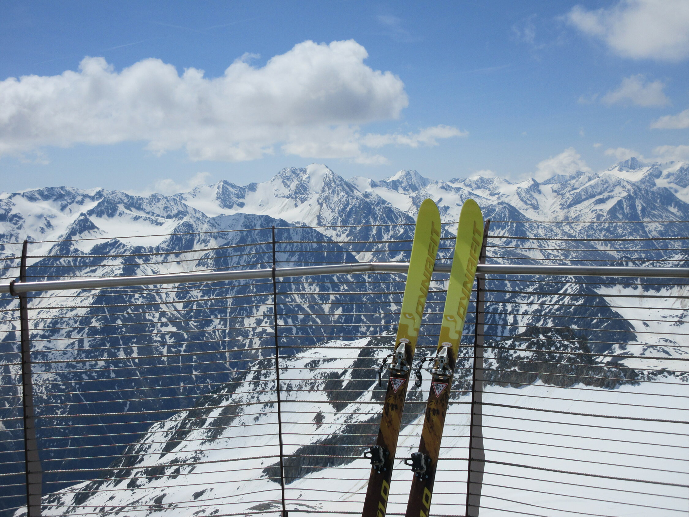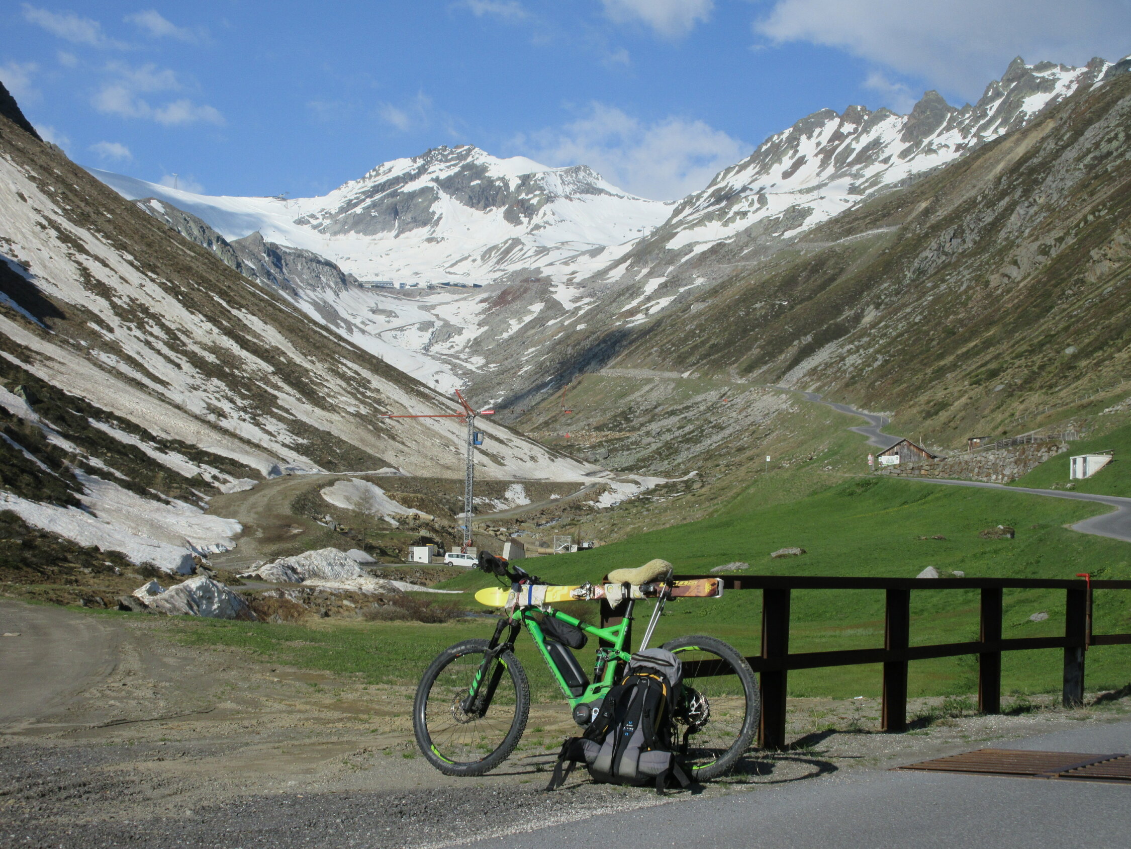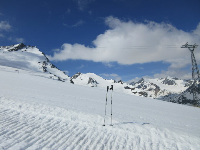 Von Sölden mit bike bis zum obersten Parkplatz, dann mit Ski über die Gletscherpiste bis Skigipfel.