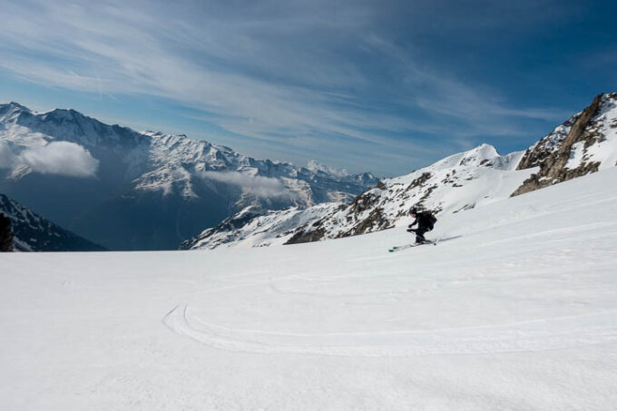 Achtung, andere Aufstiegsvariante von der Hütte weg, wegen zu wenig Schnee. Allgemein Gletscher nur knapp eingeschneit und wird schnell blank diese Saison. Abfahrt vom Galmihorn bis zu den Stauwällen gerade noch möglich.