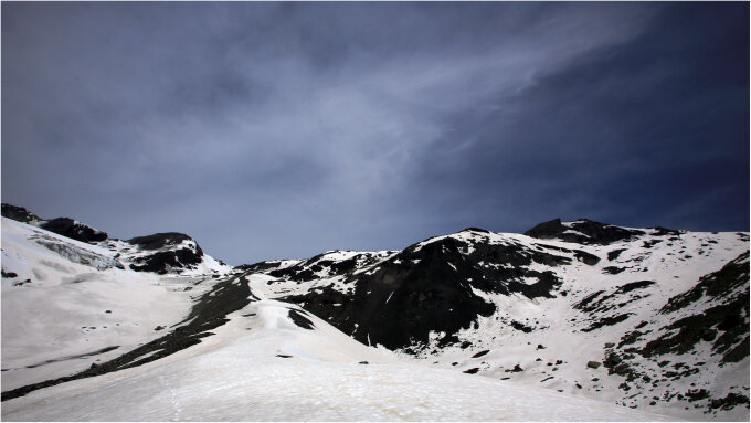 Bis zur Hütte kein Schnee, deshalb gut zu gehen. Ab dort, wo man auf den Moränenrücken laufen muss liegt zwischendurch mehr Schnee, welcher nicht immer trägt. Deshalb sinkt man hin und wieder bir zu den Oberschenkeln ein. Lässt sich jedoch ganz gut kalkulieren. Bei geschickter Routenwahl lassen sich die großen Schneefelder vermeiden, der gesamte letzte Teil, also ab etwa 3000m l