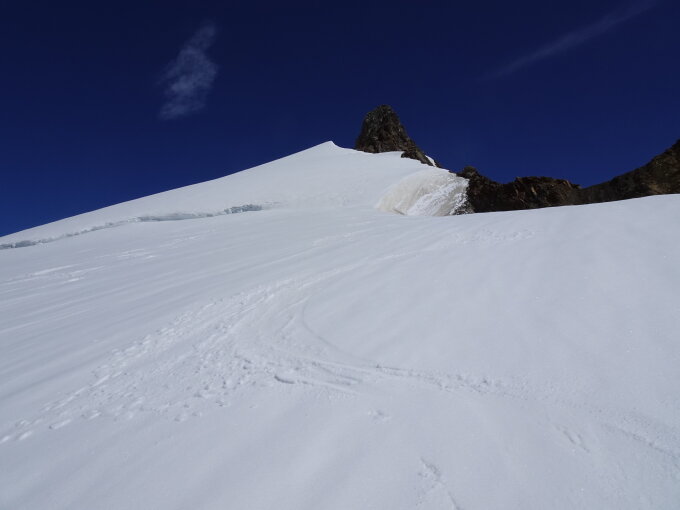 Es ist momentan besser über den Hüttenweg aufzusteigen denn über den 1. Gletscherbruch ist alles blank