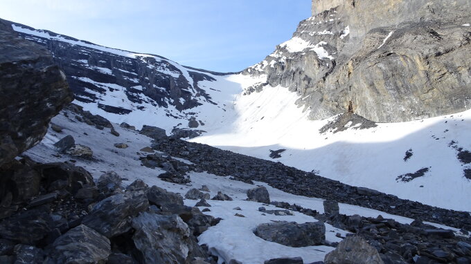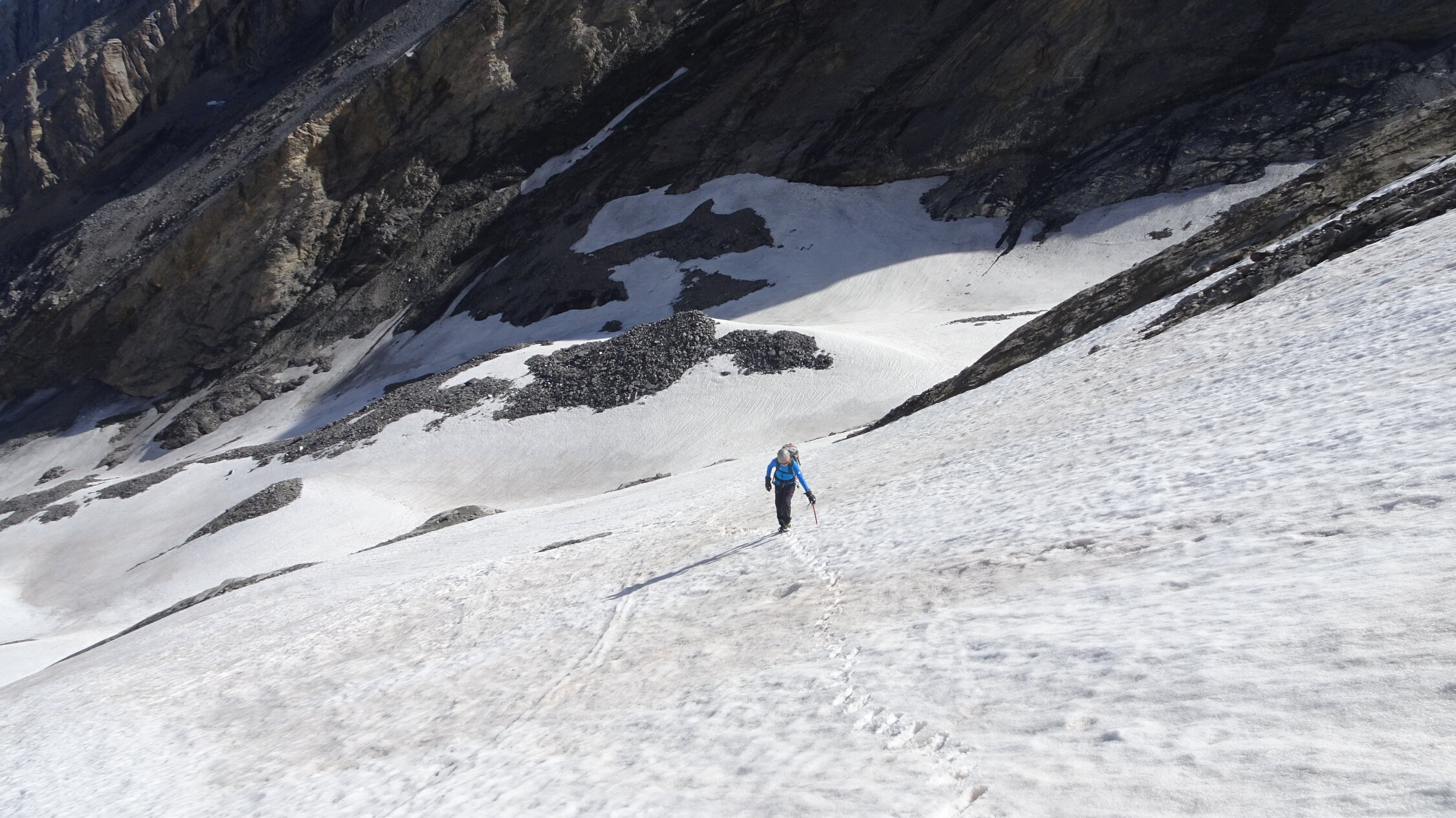 Zustieg zunächst über Wanderweg (mit weiß-roten Pfosten markiert) und danach über linker Moräne (aus Sicht des Aufstiegs) ohne Probleme. Ist dem Aufstieg über dem Gletscher (oder was von dem überhaupt noch übrig ist) vorzuziehen. Die steile Zackengratzustieg hatte sehr gute Schneeverhältnisse, am frühen Morgen noch guter Firn, am Nachmittag dann schon etwas weich aber noch gut tragend. Der Grat ist fast komplett schneefrei. Der Gipfelzustieg hatte einige wenige weiche Stellen.