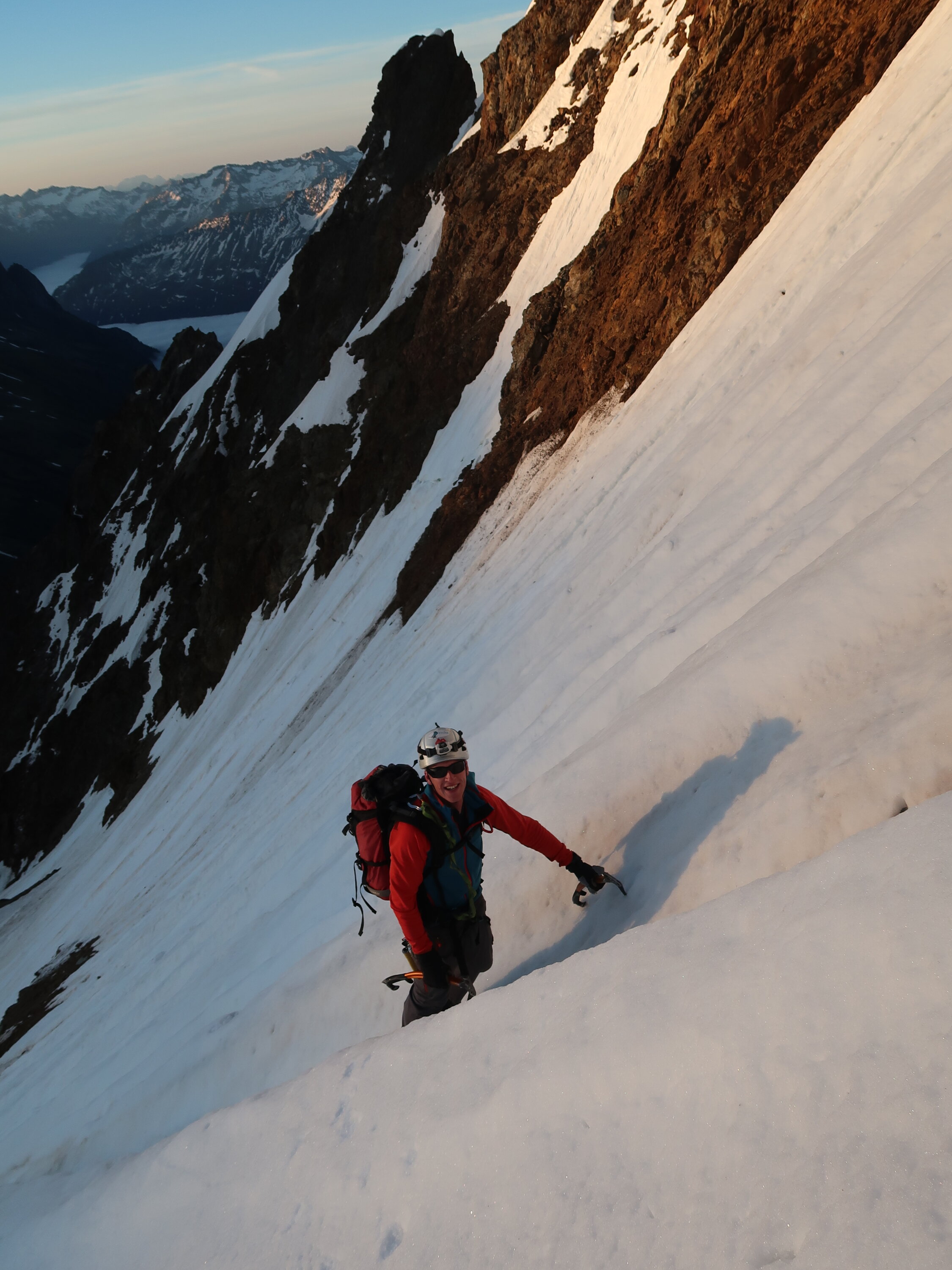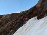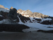 Nach klarer Nacht meist gefrorene Oberfläche - früh starten lohnt sich aber in jedem Fall. Wir waren zum Sonnenaufgang um 05.30 Uhr auf dem Gipfel und sind danach wieder durch die Flanke abgestiegen. Dabei setzte bereits leichter Steinschlag ein. Deutlich später wirds dann whs. ungemütlich.