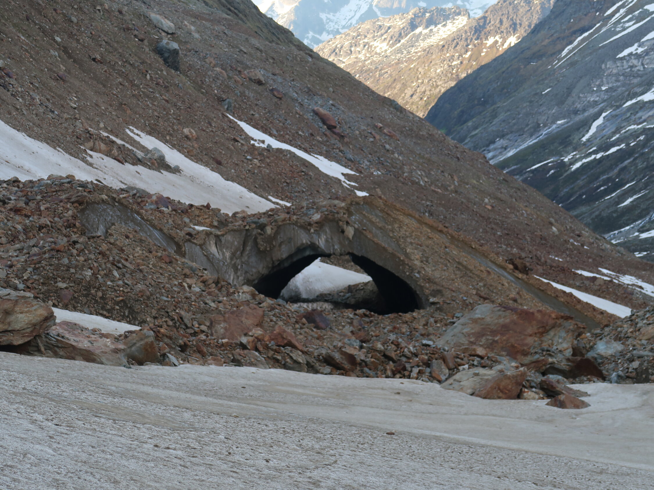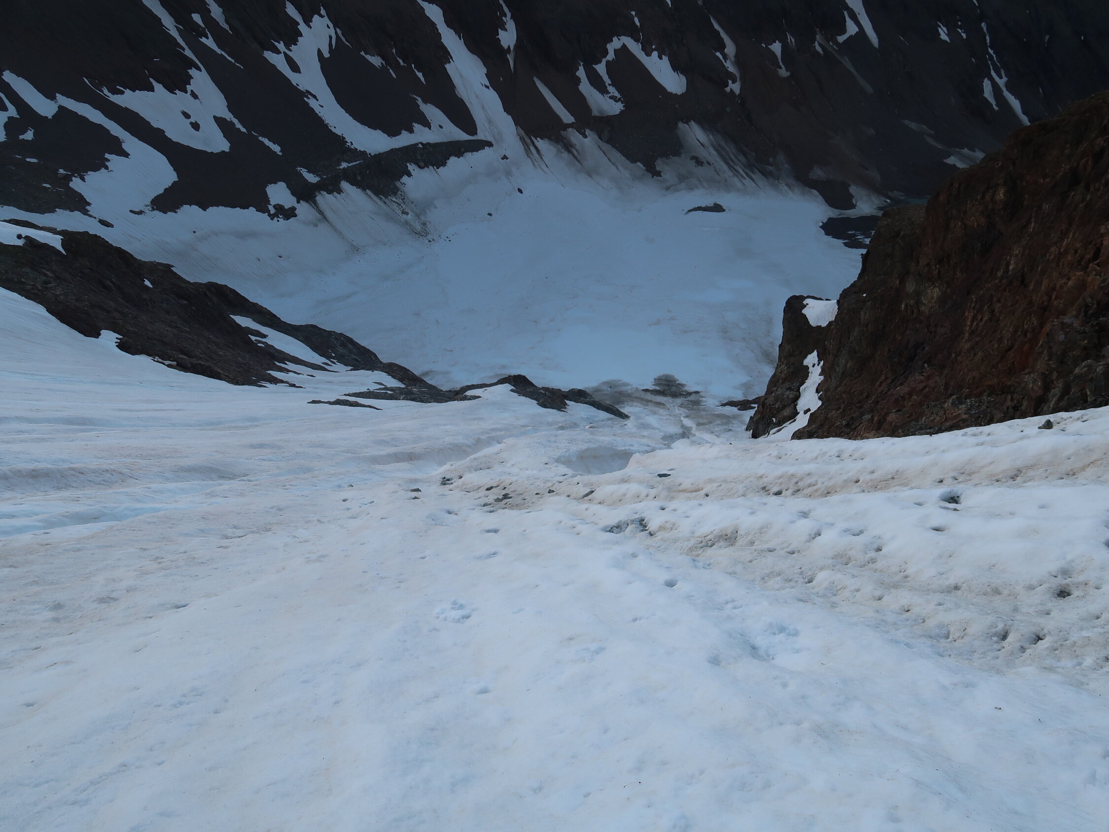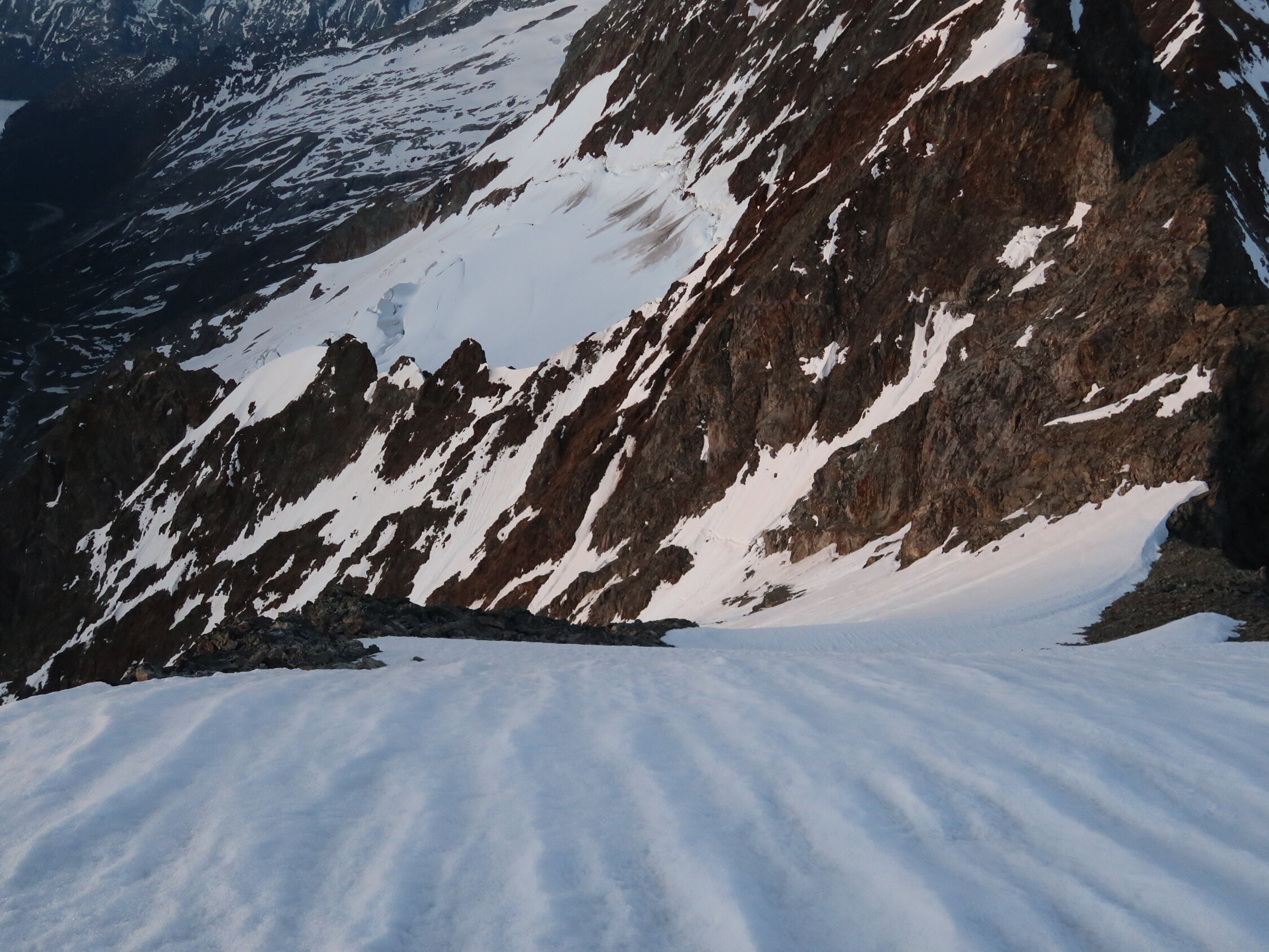 Zwei kleine Felsstufen bereits vorhanden, ansonsten noch alles im Firn gangbar. Teilweise tiefe Furchen, welche sich jedoch gut begehen lassen.