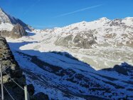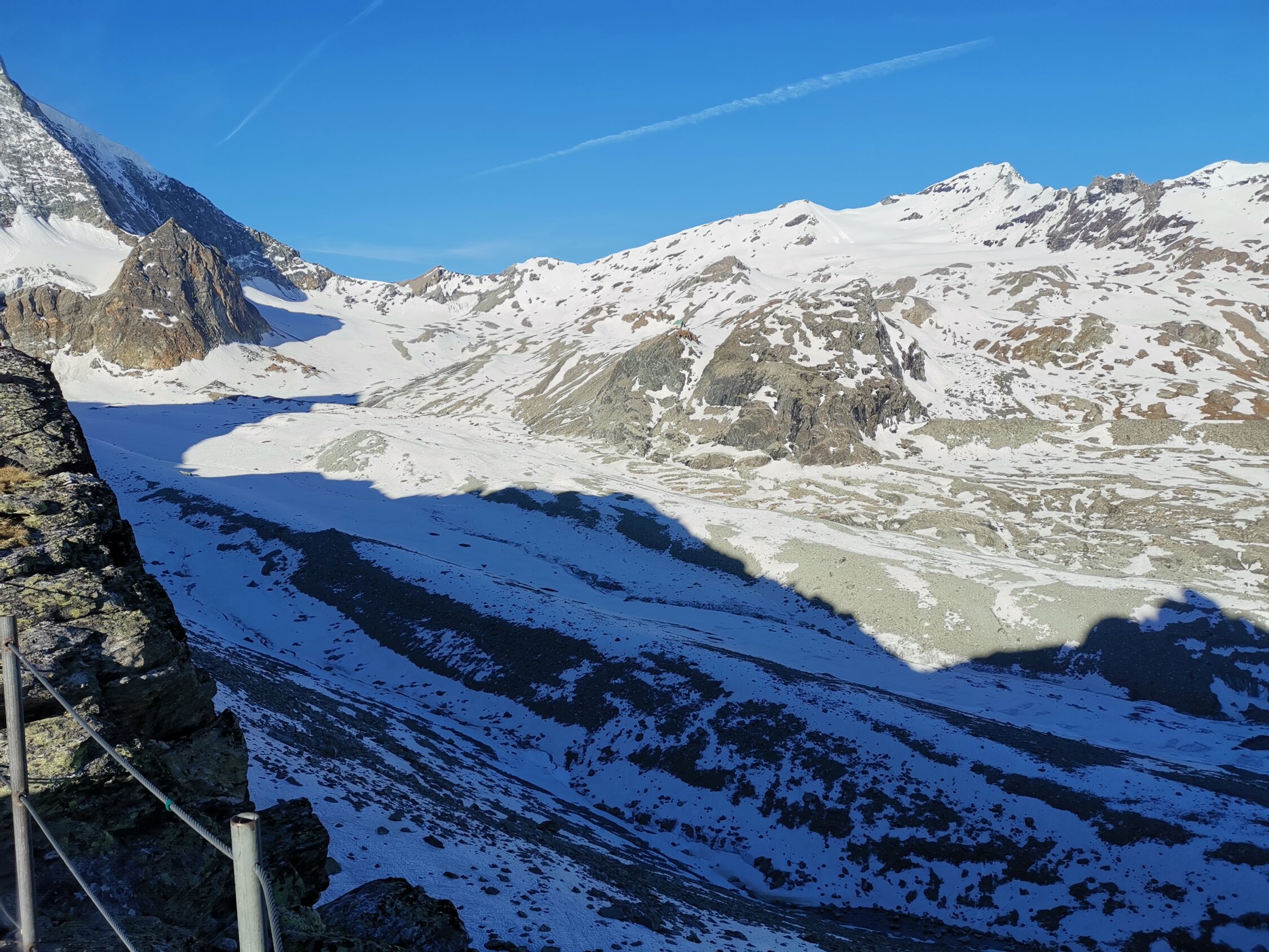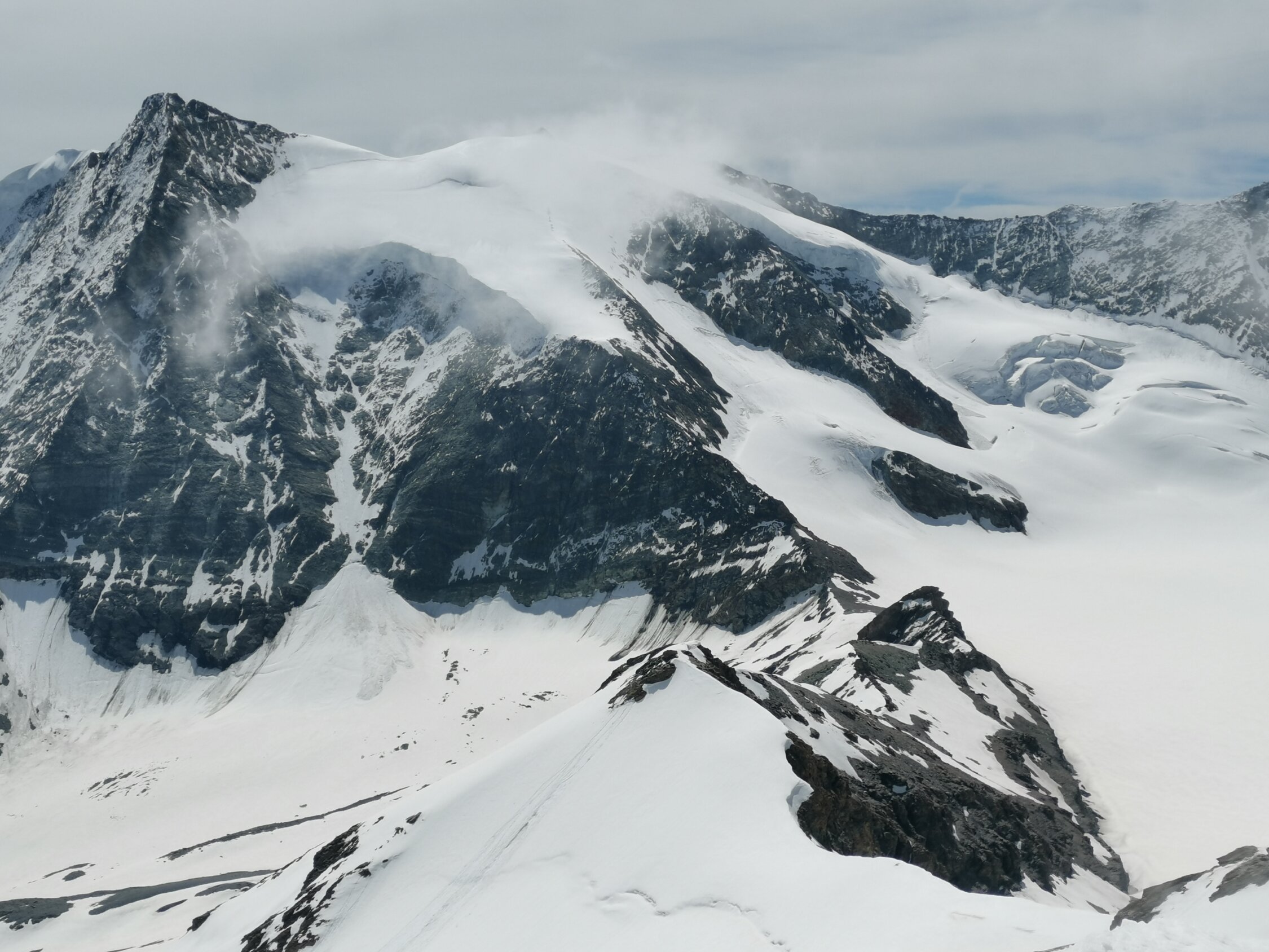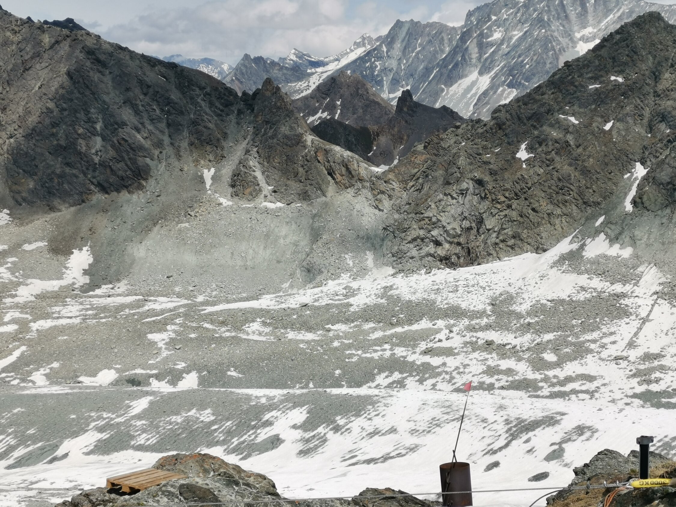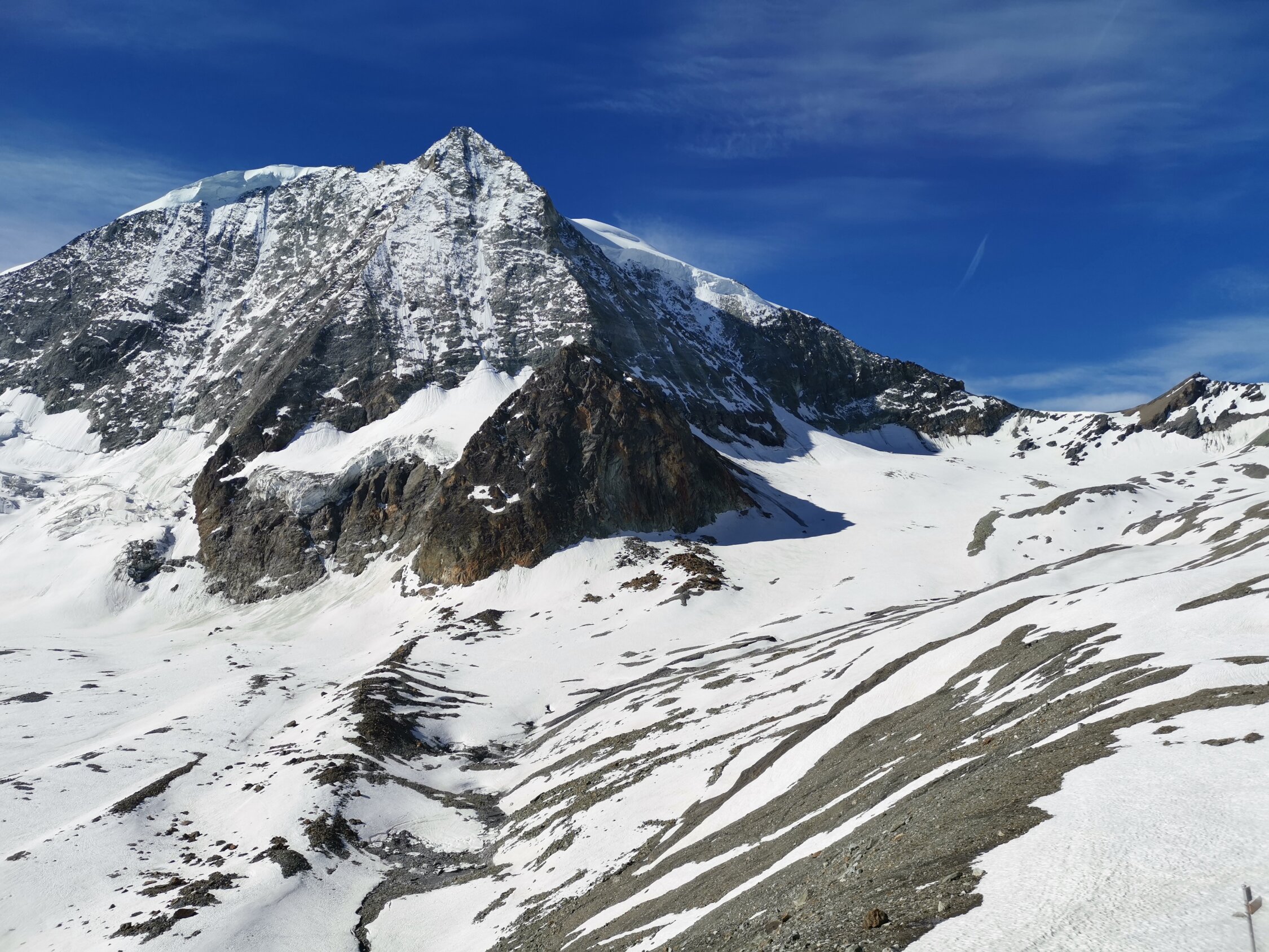 Auf dem Gletscher Büsserschnee. Mühsamer Rückaufstieg über steile bröckende Flanke zum Pass.