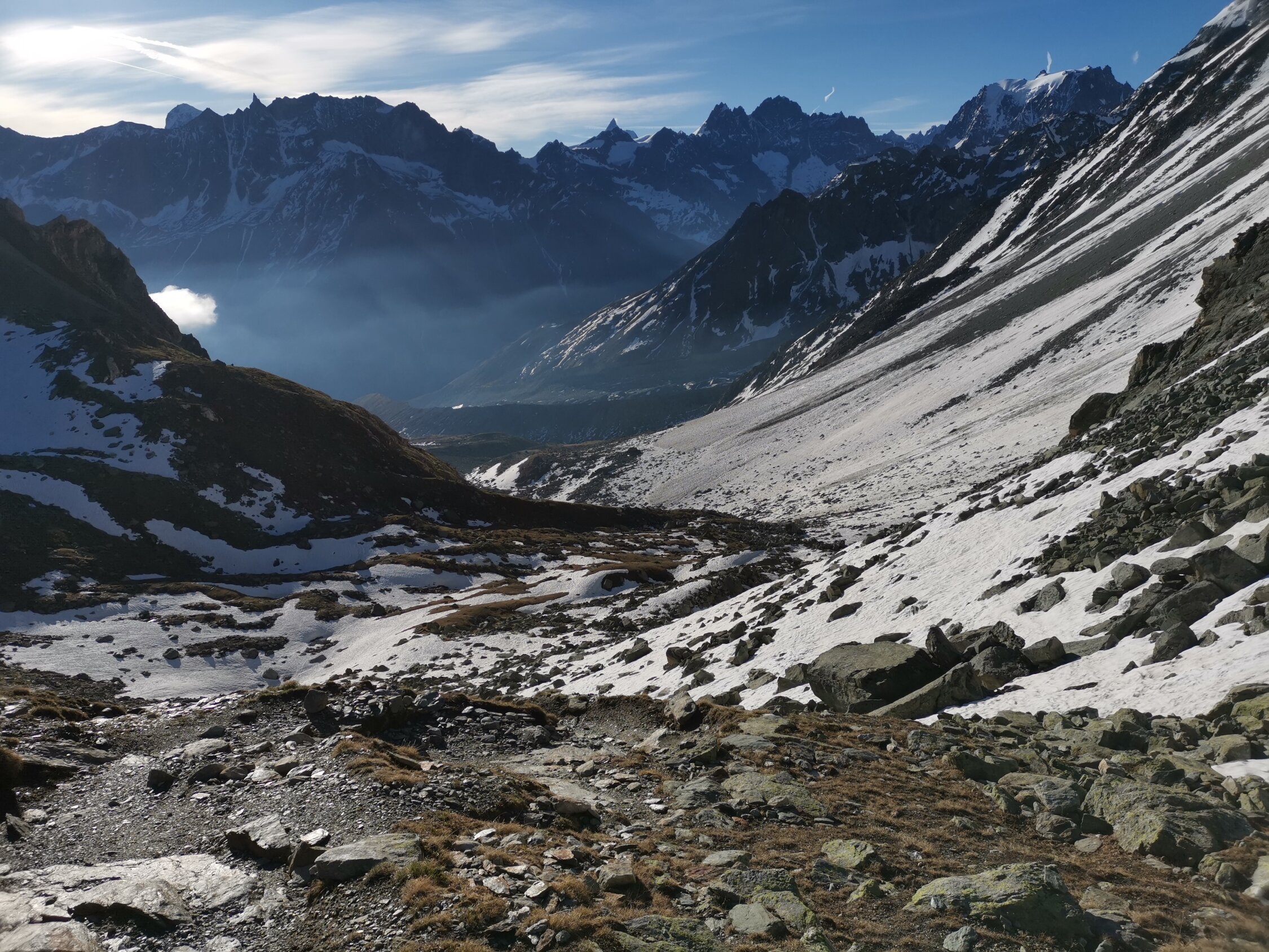 Alte Spur zum MB de Cheilon. Spurführung jedoch nicht wie in der Karte gezeichnet, sondern Aufstieg sondern rechts um den Eisbruch herum. Passaufstieg gerade noch durchgehend.