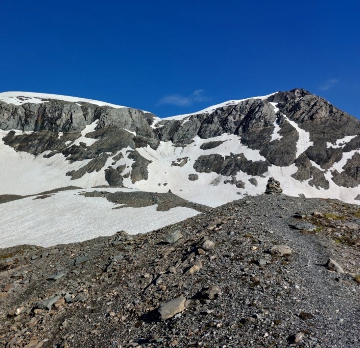 Ab St.Martin. Bis Sardonahütte Weg schneefrei bis aud die problemlose Bachquerung. Weiter dem markierten Bergweg entlang bis zum Abzweiger Richtung Westen. Weg/Wegspuren über die Moräne bis 2650 beim Sardonagletscher meist aper. Dann können einige Schneefelder für den Aufstieg (45°, Steigeisen) genutzt werden, um dem unteren rutschigen Teil des Mittelgrates auszuweichen. Danach dem Fixseil entlang weiter. Ganze Passage ohne Schnee. Auf dem Grat Richtung Gipfel wieder aper wie schon im März. Abstieg über den Segnasgletscher, welcher an einer Stelle schon blank ist. Kann jedoch ohne Schwierigkeiten umgangen werden. Auch noch den Segnas und Dolf mitgenommen, beide Routen problemlos. Ein Blick Richtung Glaserrus zeigt, dass im obersten Teil der Rus nud noch ein schmales Schneeband liegt.