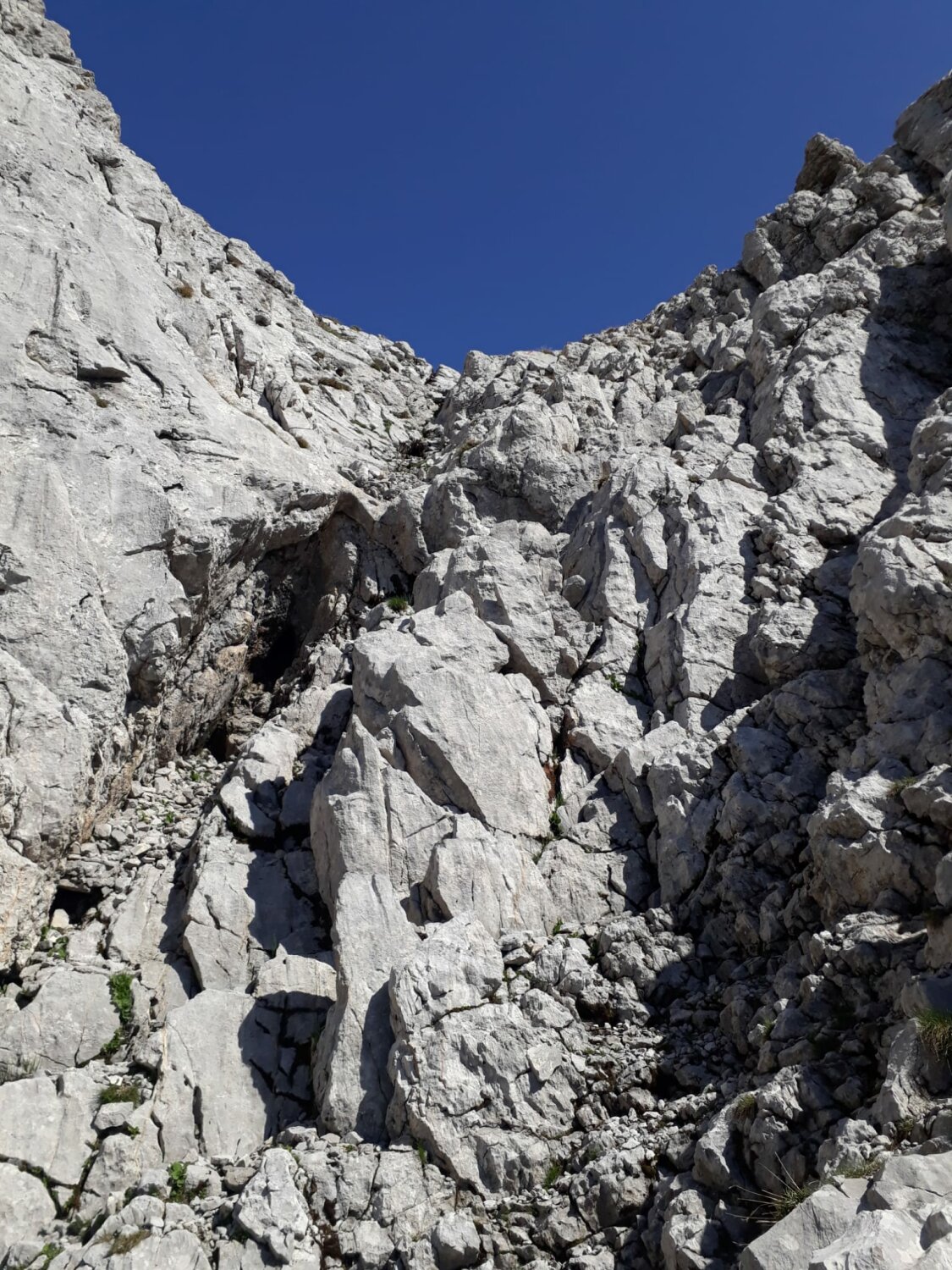 Im Kamin herrschen super Verhältnisse. Alles trocken. Lediglich kurz vor der Schlüsselstelle muss man sich links an einem "Schneehaufen" vorbeischummeln. Das wird sich aber auch bald erledigt haben.
