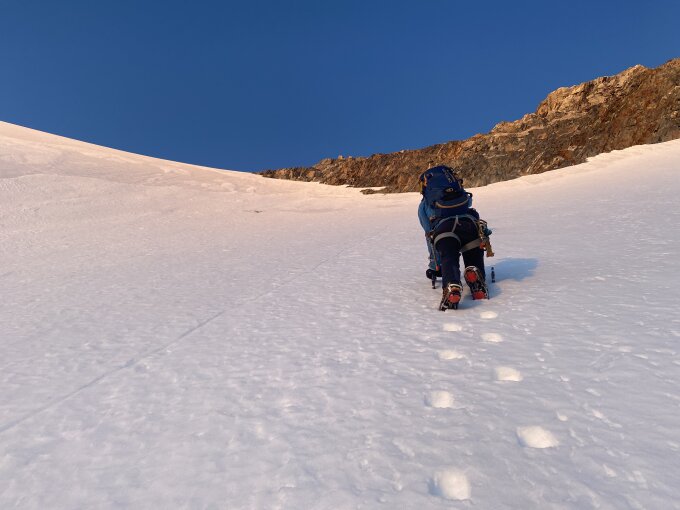Start in Umpol um 03:00 Uhr. Nach dem Sonnenaufgang erhält die Wand sofort Sonneneinstrahlung und die Temperatur steigt spürbar. Folglich wird danach auch der Schnee sofort weich.