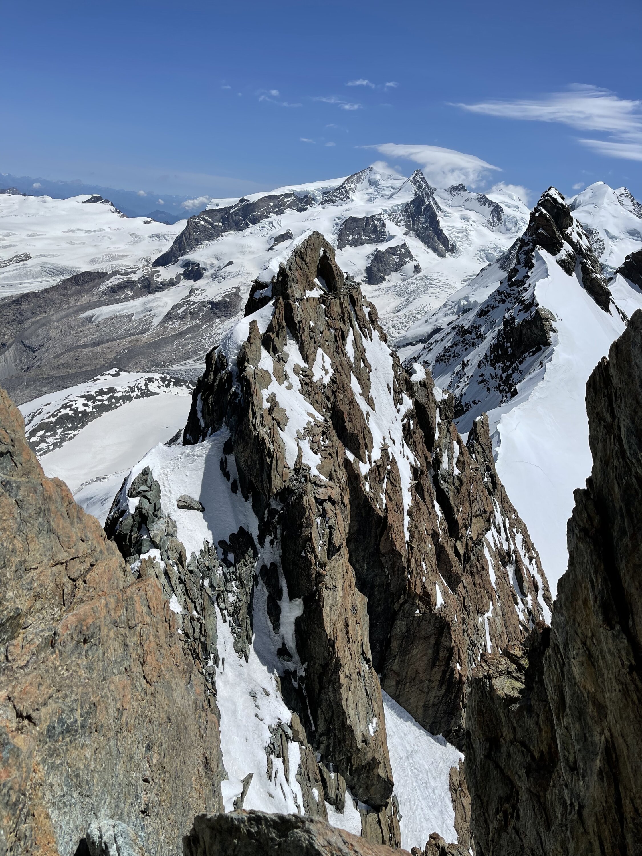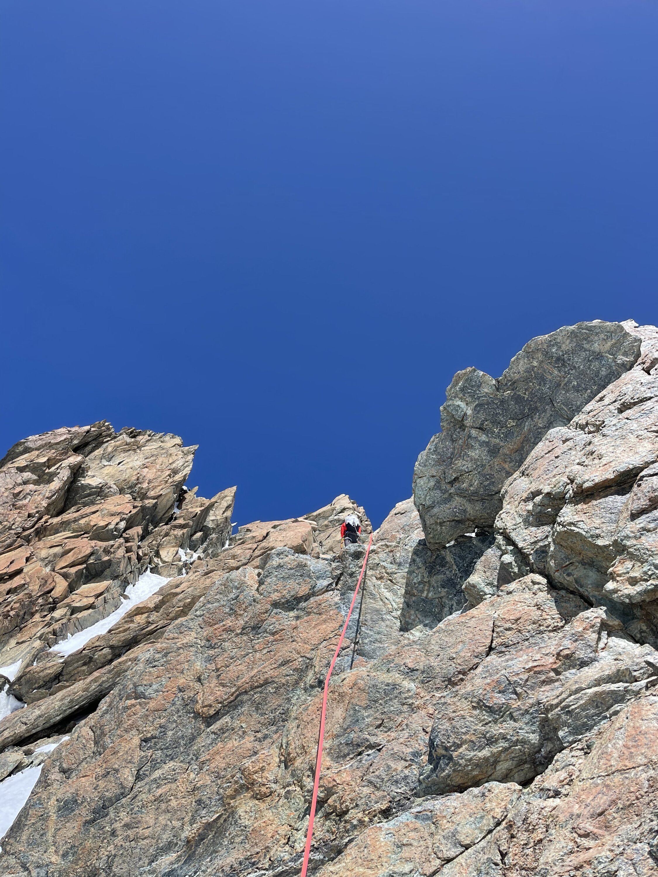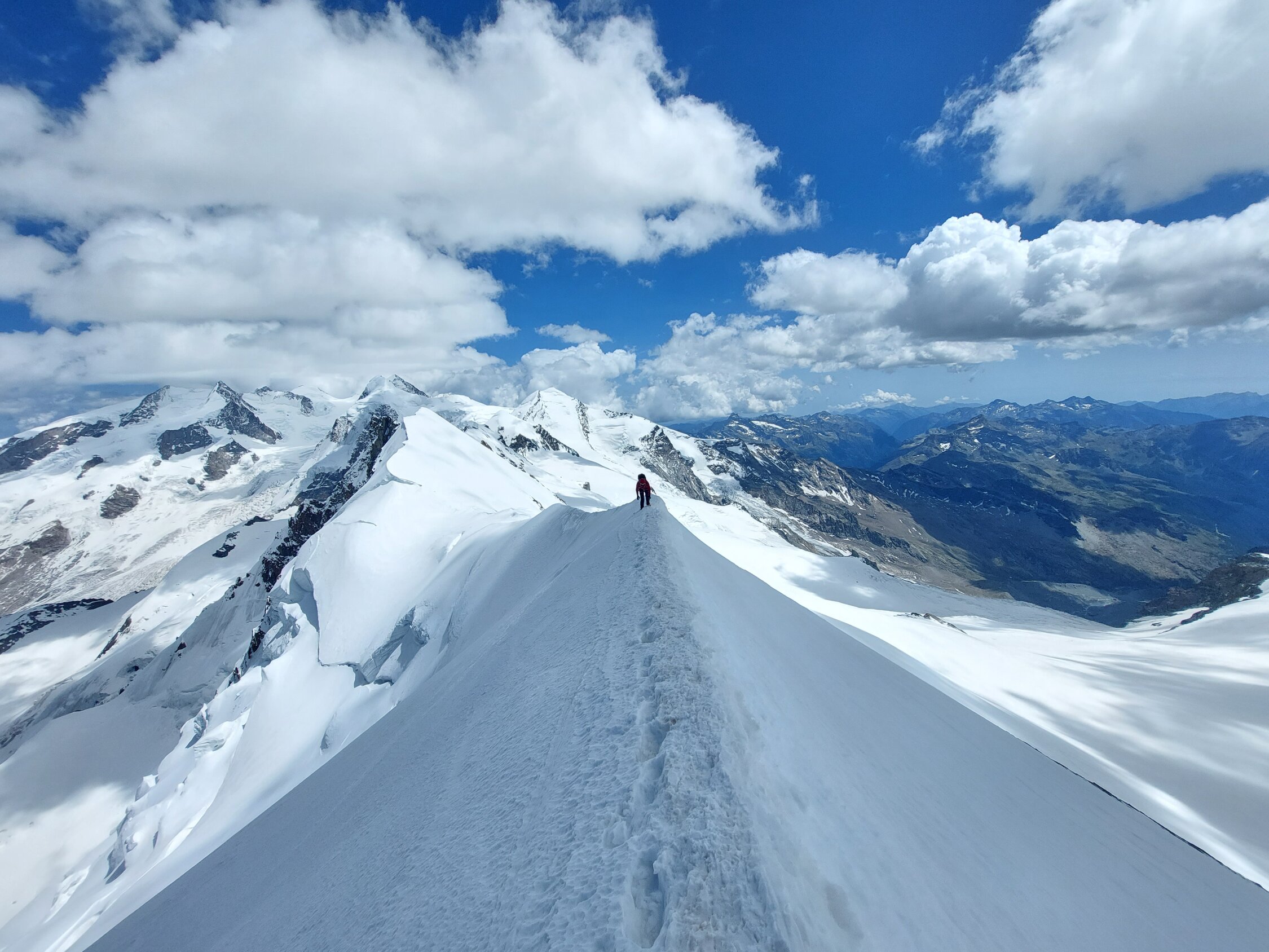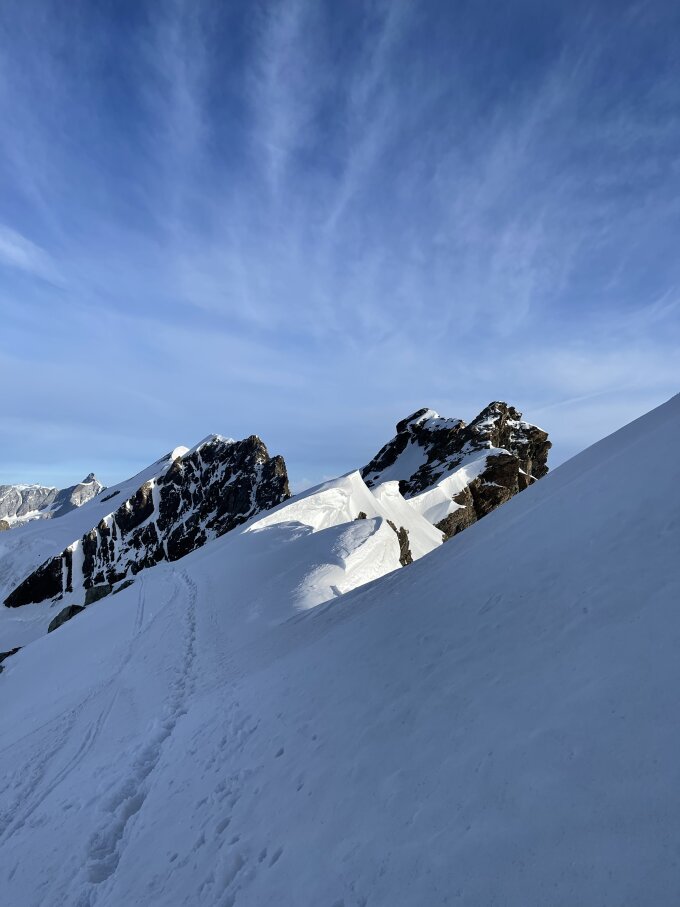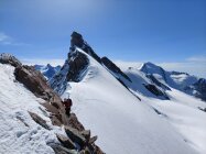 Die Überschreitung ist eine sehr lohnenswerte Tour mit abwechselnden Firnpassagen und schöner Kletterei in gutem Fels. Gestern war es recht einsam, dies ändert sich wohl wenn die Bahn ab Juli 2h früher fährt.