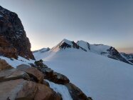 Tags zuvor Aufstieg von Zermatt zum Biwak Rossi e Volante, dies ist kaum empfehlenswert, da sehr lang und im Skigebiet. Das Biwak war mit 10 Personen voll belegt (sehr schöne Lage, es gibt einen Tisch, abgenutzte Matratzen und Wolldecken, kein Wasser ausser kleine Rinnsale am Fels).