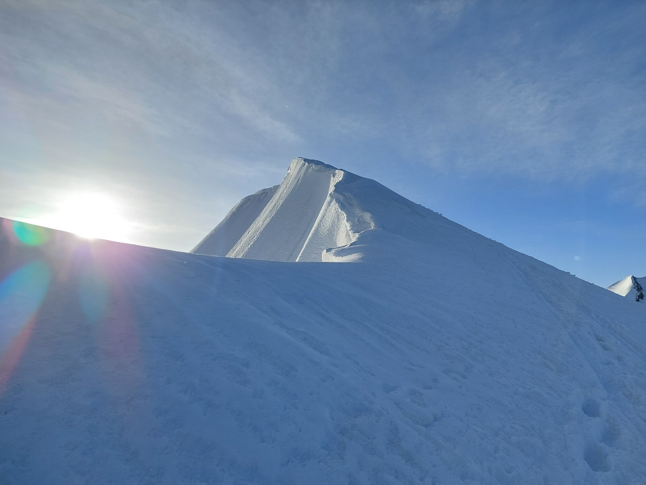 Aufstieg 6:30 Uhr zur Roccia Nera vom Biwak angenehm in gefrorenem Schnee. Die restlichen Firnpassagen waren auch gut begehbar (im Laufe vom Tag mit bisschen mehr Vorsicht wegen weichem Schnee, insbesondere beim Passieren der teils ausgesetzten Scharten). Kletterei angenehm in trockenem Fels. Momentan kann in manchen Rinnen noch im Trittschnee aufgestiegen werden. Von den Zwillingen haben wir je 2 Mal abgeseilt mit 50m Seil. Komplette Tour mit Steigeisen gegangen.