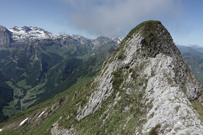 Nordseitig war es nach Regen in der Nacht zuvor nass und rutschig; Nordaufstieg zum Schwiren daher etwas heikel. Ansonsten top Bedingungen, nicht zu heiss, nicht kalt, nicht windig; nur ein kleines Schneefeld am Nordfuss des Schwiren (10 m über Schnee zu queren, um zum Einstieg des Steilaufschwunges zu gelangen)