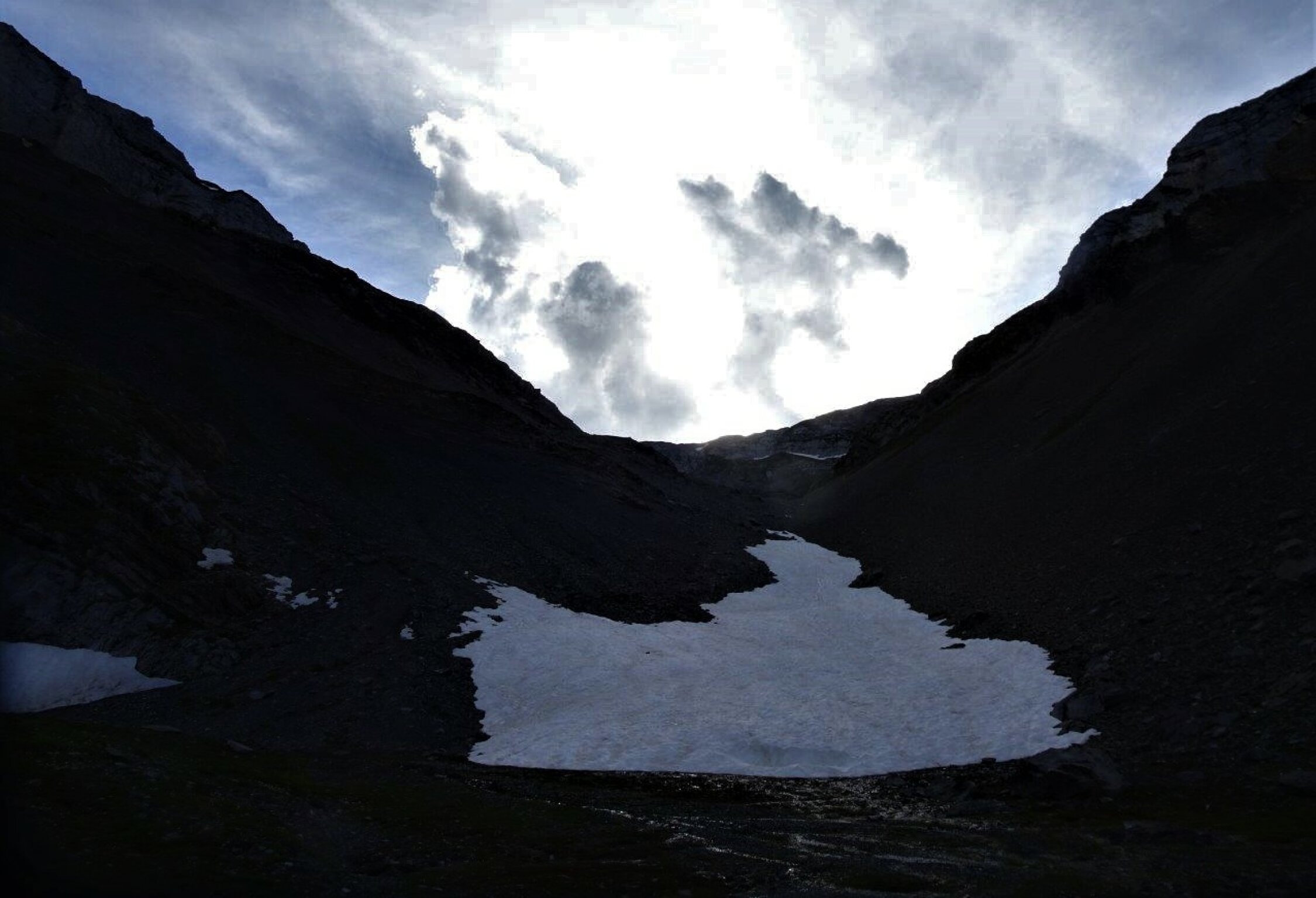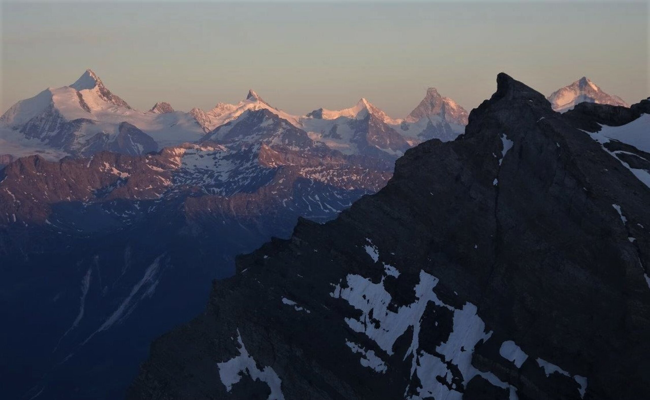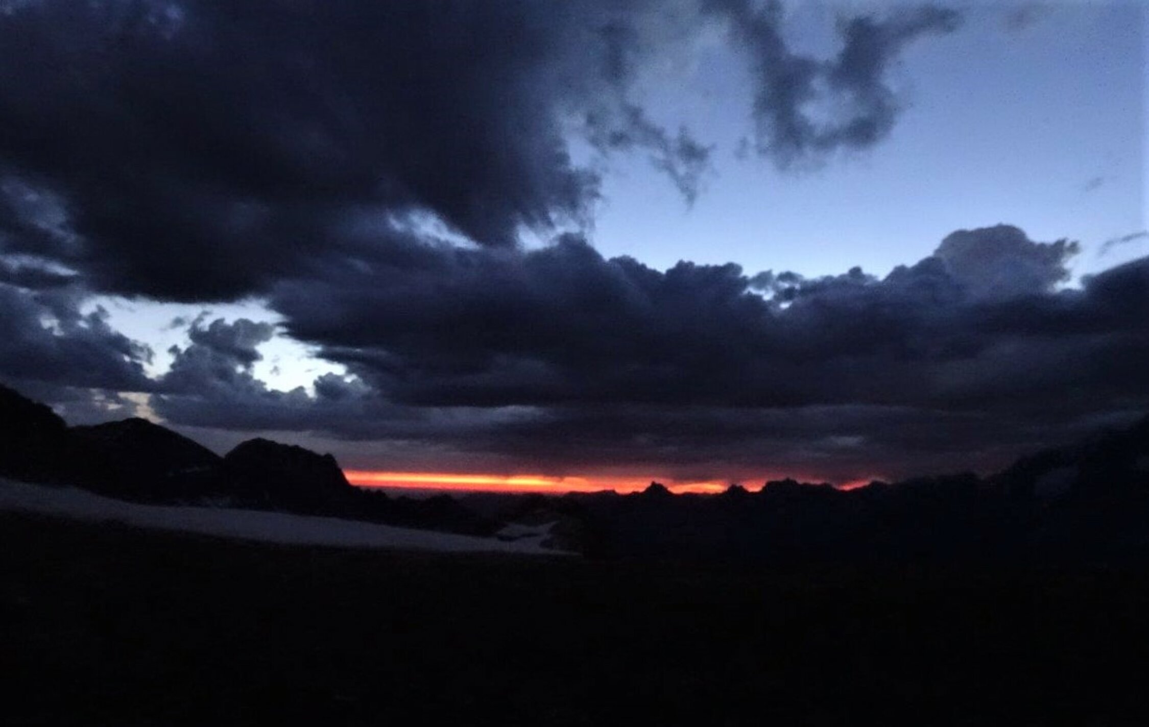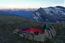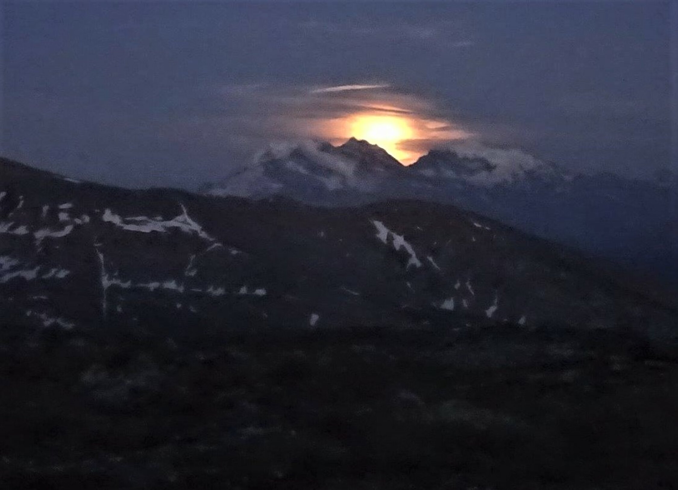 Mild auf dem Gipfel um 21.30 Uhr mit +6° in der Nacht +4°. Genial schöner Mondaufgang über dem Monte Leone/Simplon um 22.15 - später dann aber abrupte Mondlichtreduktion wegen eines schwarzen Wolkenbandes kommend aus der Region Wildstrubel. Zu Beginn noch trocken, dann aber auffrischender Wind aus SW. Ab 3 Uhr bis 4 Uhr stürmischer Wind/Böen und nicht allzu starker Regen. Um 5 Uhr aufgrund der unklaren Wetterverhältnissen Biwakmaterial eingepackt und ohne Regen abgestiegen. Interessanterweise war es in der Schwarenbach-Region trocken.