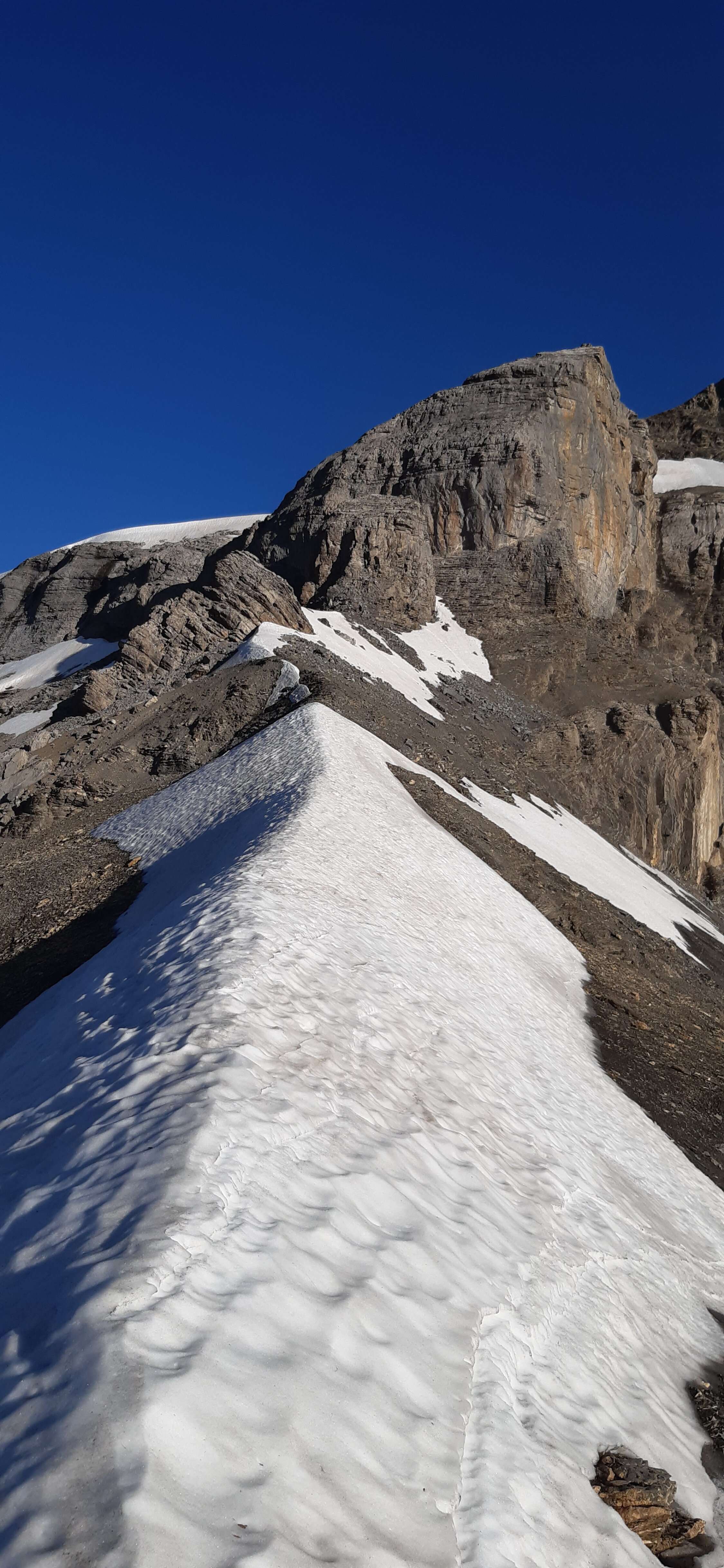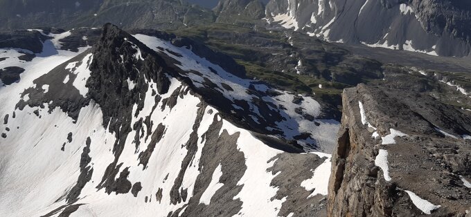 Auf dem Grat vor dem Gratkopf, darum herum und in der Querung noch Schnee, dort Steigeisen nötig. So eine abwechslungsreiche Tour! Abstieg über Leiterli.