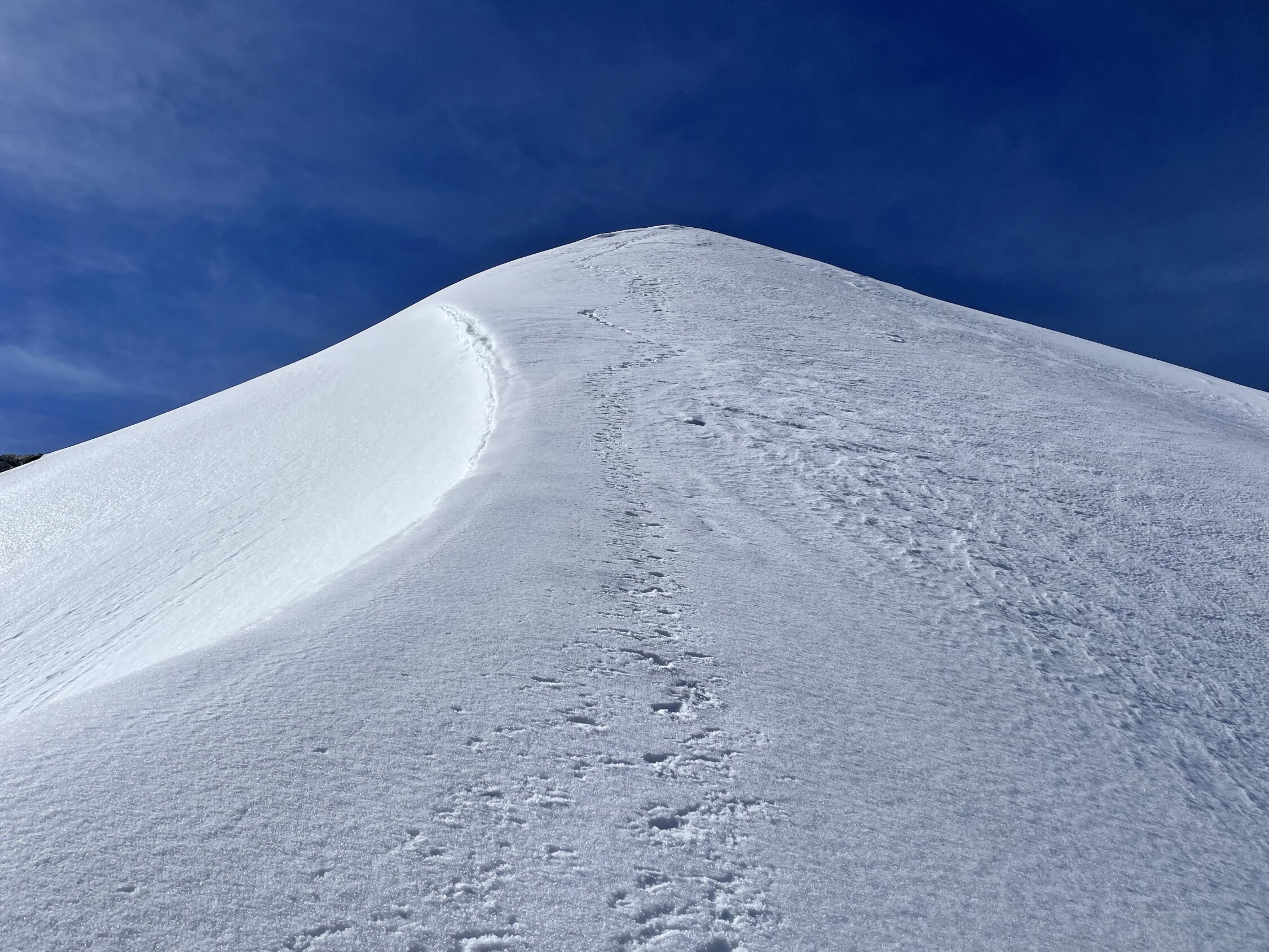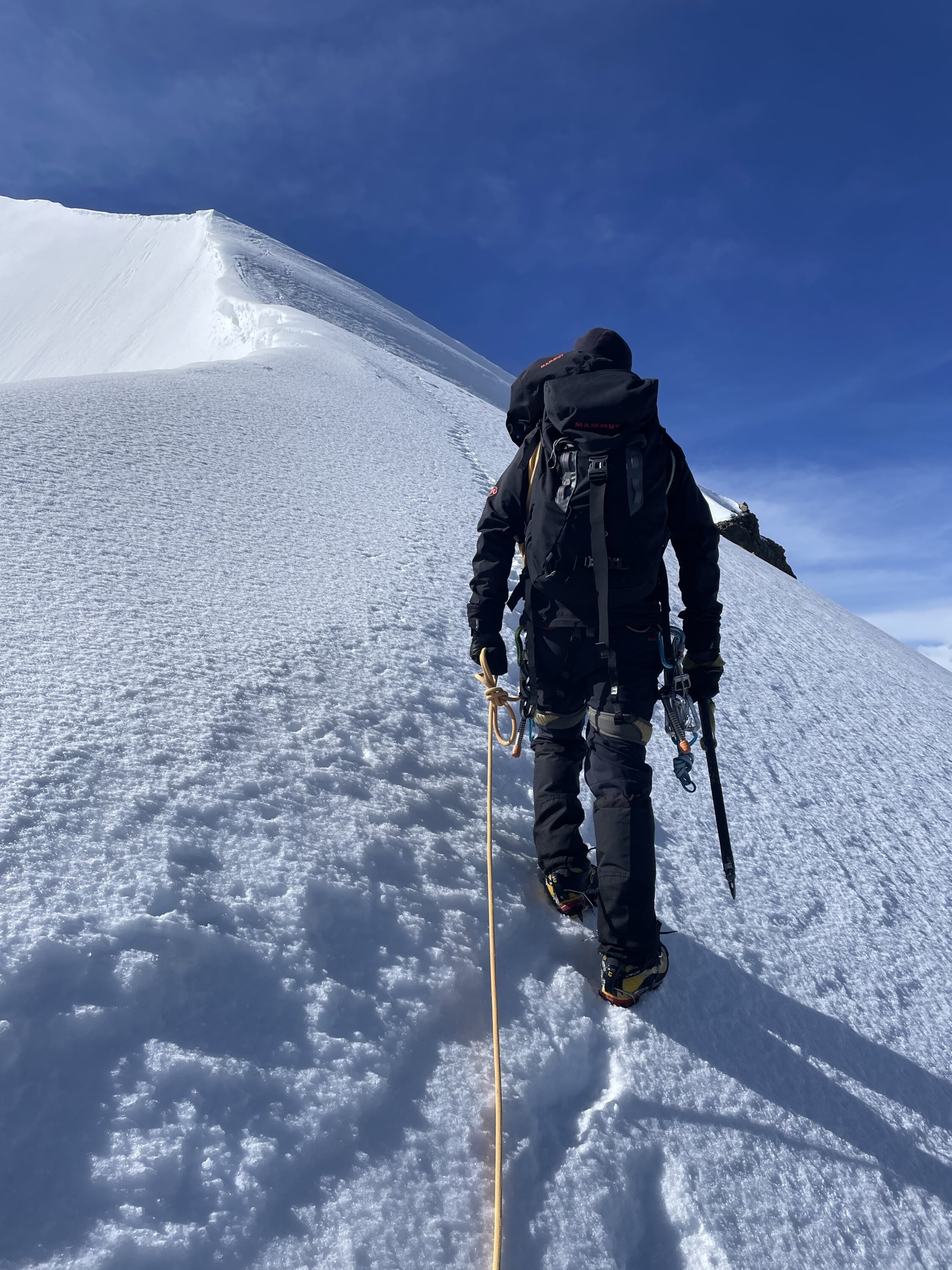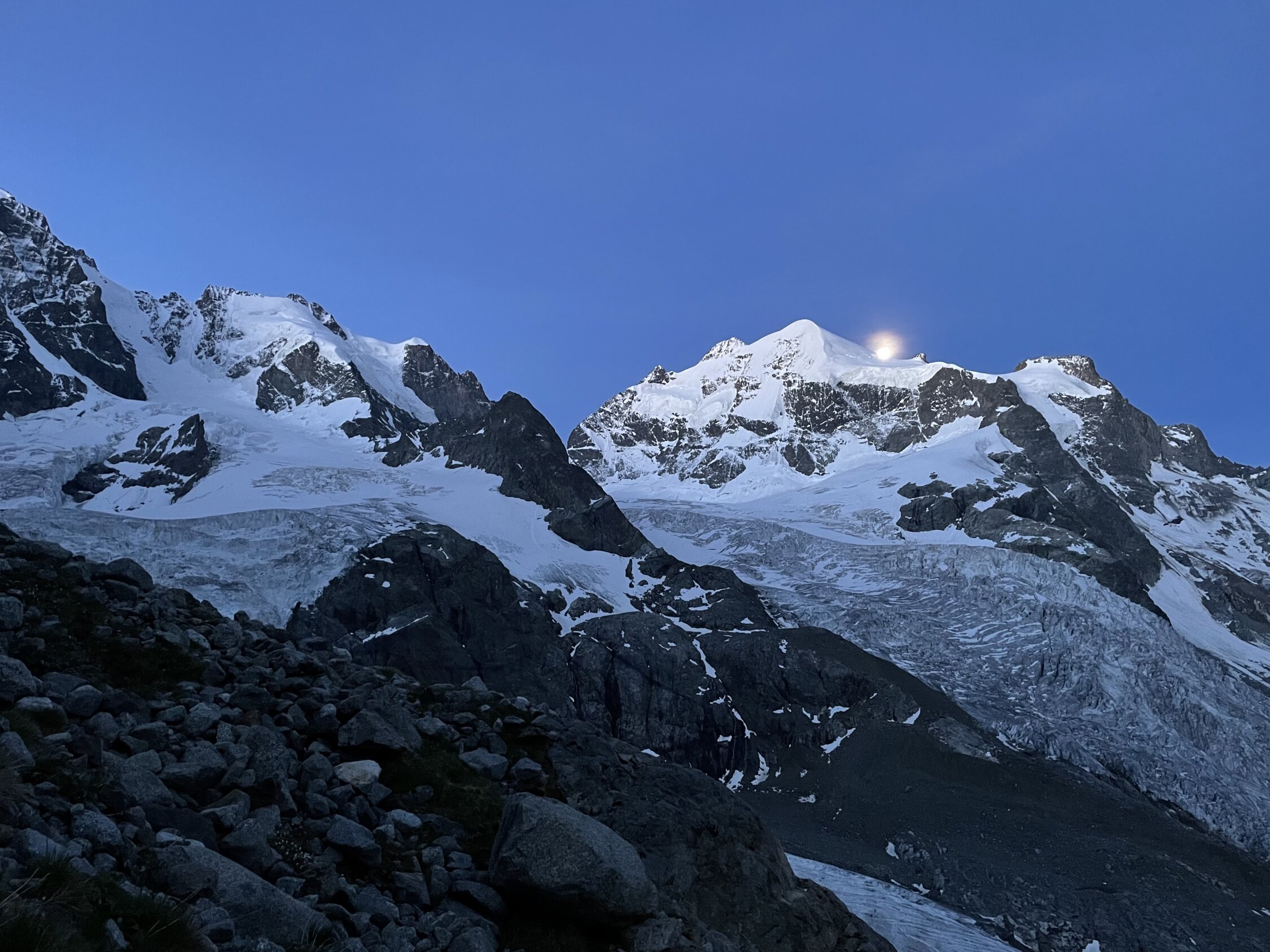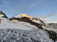 Generell sind die Firnverhältnisse nicht optimal wir sind bereits am Morgen eingebrochen auch am eigentlichen Biancograt oft eingebrochen. Die Schneeauflage ist eine Mischung aus Graupel und körnigem Nassschnee.