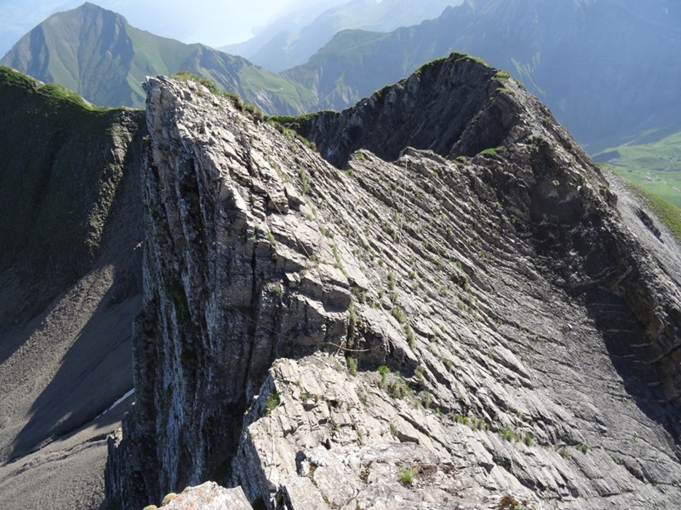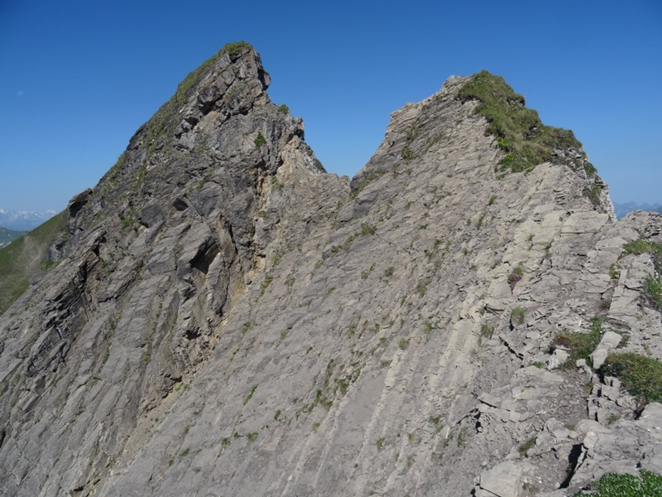 Der Abschnitt über den Latrejespitz ist etwas heikel, da das Gestein wirklich ein Bruchhaufen ist. Das Fixseil zeigt die Richtung an und ist sicher eine psychologische Hilfe. Belasten würde ich dieses Seil nicht. Die Verankerungen sehen auch sehr exotisch aus.