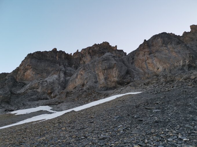 Zuerst bin ich von der Gpaltenhornhütte die SW-Route angegangen. Der Durchstieg durch den Felsriegel erschien mir als Solist etwas knifflig. Vor allem der Abstieg und die Routenfindung von oben.