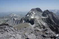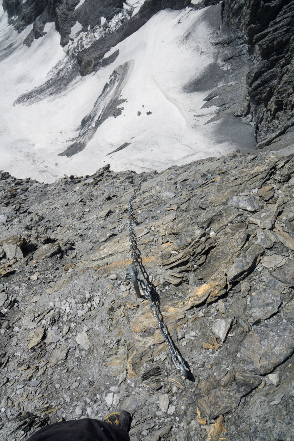 Im Bereich um 2750- 2800m Altschneefelder, die morgens noch recht hart waren. Ohne Steigeisen und Eispickel über die Felsinseln und -zungen den Bereich durchquert, einfacher ist es hier dann doch mit zumindest Leichtsteigeisen im Gepäck. Die letzten 50Hm unter dem Grat dann parallel zum eigentlichen Weg im Felsen hoch (I, ev. II- sowie steiler Schutt, T4+), das dortige Altschneefeld umgehend. Ab dem breiten Gratrücken auf 2930m schneefrei.