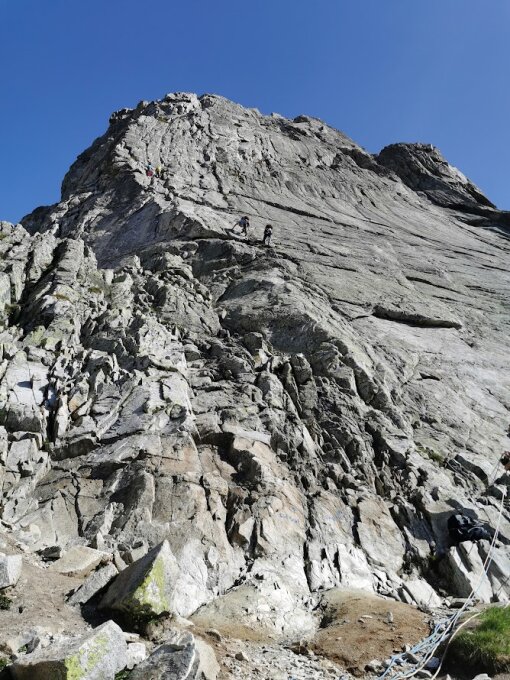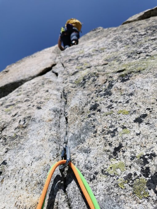 Trotz der im Tal herrschenden Hitze sehr gute Bedingungen am Wochenende in diesem großartigen Klassiker mit wunderschöner Linie und Felsqualität. Fels trocken, auch beim Abstieg, bei dem man aktuell keinen Kontakt zu Schneefeldern mehr hat.
